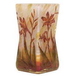 Daum vase, geometric shape with cameo and enameled floral design, cameo signature, 4.25"h