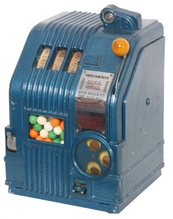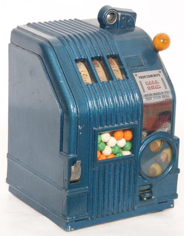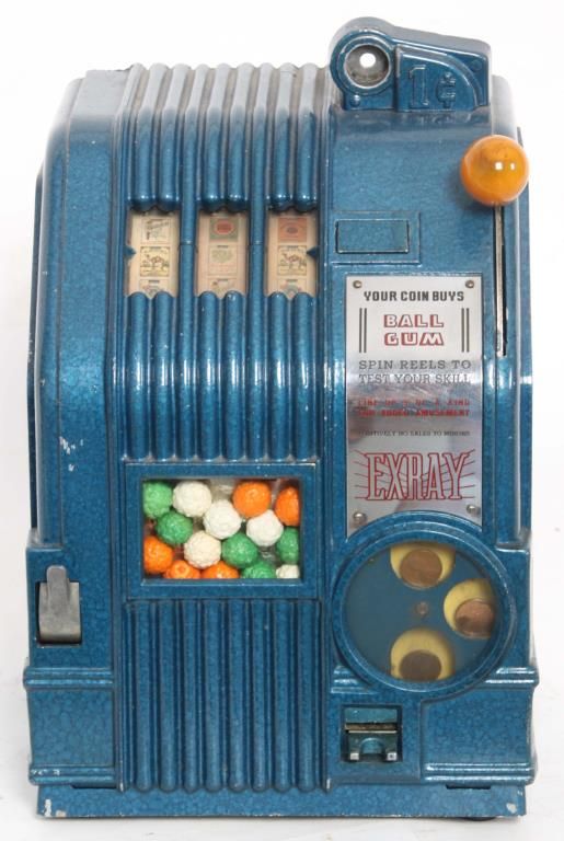 Daval Mfg. Ex-Ray 1 Cent Slot Machine. Daval Mfg. Ex-Ray 1 Cent Trade Stimulator Slot Machine. Case has an original blue hammer-tone painted finish with bakalite knob lever handle; has a penny display on the front below the handle and to the right has a display showing the gumball prize. The reels are printed with various cigarette brand and has a signature tag on the front. Circa 1940, measures 13 in. high x 9.5 in. wide x 8.5 in. deep.
