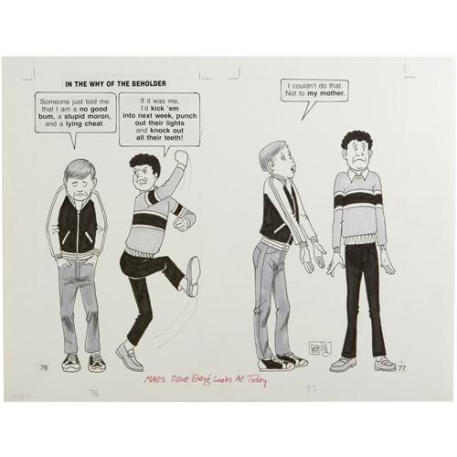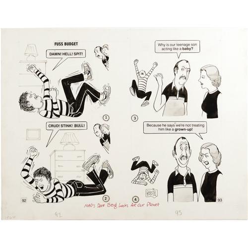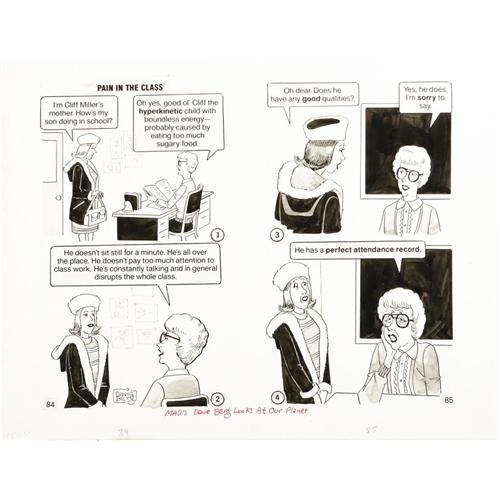 <B>Dave Berg - "Mad's Dave Berg Looks at..." 1-page Story Original Art, Group of 3 (Warner Books, 1987-91). </B></I> This laugh-filled lot spotlights three knee-slapping Dave Berg gags. These gags include "Pain in the Class" and "Fuss Budget," which were printed on pages 84-85 and 92-93 of the paperback, <B>Mad's Dave Berg Looks at Our Planet</B></I>. Also included is "In the Why of the Beholder," which was printed on pages 76-77 of <B>Dave Berg Looks at Today</B></I>. Each page has an overall size of 14.5" x 11", and the condition of the art is Excellent. <BR><BR><b>Shipping:</b> Flat Material, Small (<a target="_blank" href="http://www.heritageauctions.com/common/shipping.php">view shipping information</a>)
