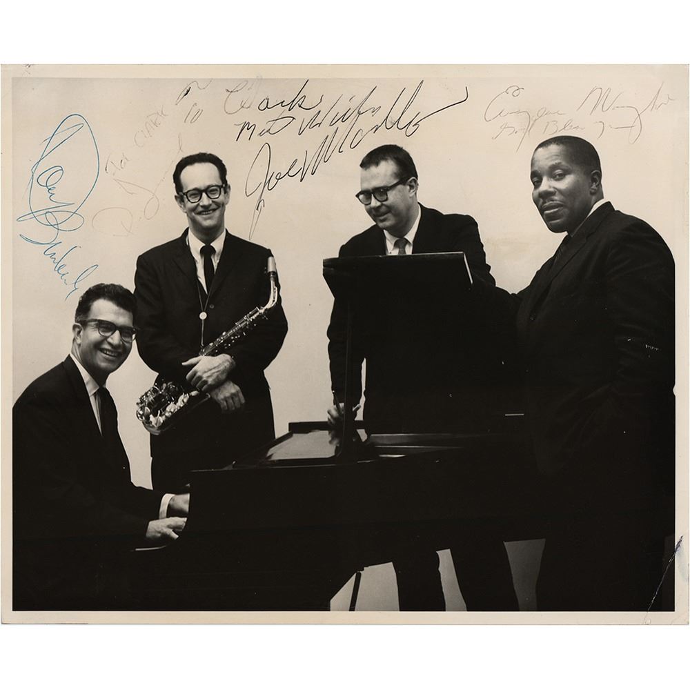 Vintage glossy 10 x 8 photo of the Dave Brubeck Quartet, signed and inscribed in ballpoint, "Dave Brubeck," "For Clark, P. Desmond," "To Clark, Best Wishes, Joe Morello," and "Eugene Wright, God Bless You.” In fine condition, with the signatures of Desmond and Wright light but legible.