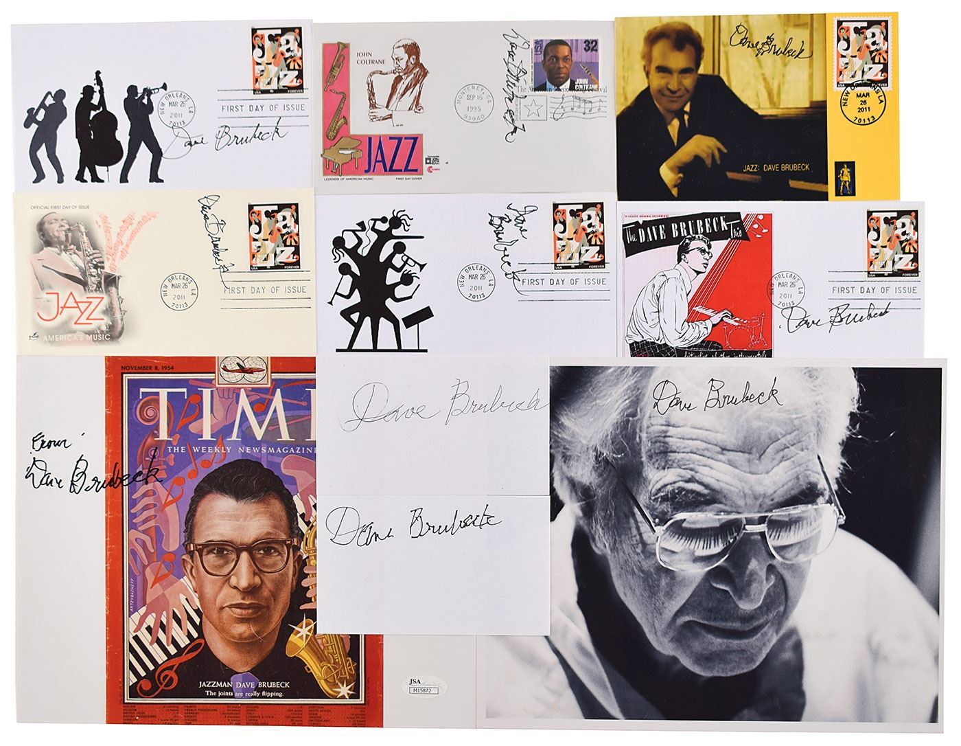 Group lot of 10 items signed in black ink or felt tip by Dave Brubeck, with formats including: 5 x 3 cards (2), signed photos (3), and first day covers (5). In overall fine condition, with one photo showing evidence of a removed inscription. Accompanied by a certificate of authenticity from JSA.