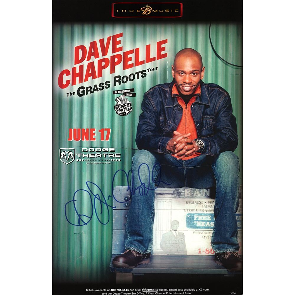 Color 10.75 x 16.75 poster for a Dave Chappelle concert at the Dodge Theatre in Phoenix, Arizona, on June 17, 2004, as part of his ‘The Grass Roots Tour,’ signed in blue felt tip by the comedian, who adds a peace sign. In very fine condition. The consignor notes that the autograph was obtained in person.