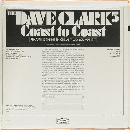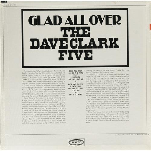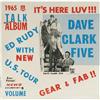 <B>Dave Clark Five Mono LP Group of 3 (1964-65).</B></I> This group included two of the group's biggest albums from the heady years of 1964 and 1965, plus the Ed Rudy series interview with them in 1965. Included: 1) the debut album, "Glad All Over" (Epic 24093, 1964) -- Condition: MT 9 (still in shrink wrap)/ NM 8; 2) the fourth album, "Coast To Coast" (Epic 24128, 1965) -- Condition: Still sealed; 3) the interview album, "It's Here Luv!" (INS Radio News 1005, 1965) -- Condition: MT 9/ MT 9. <I>From the GRT Collection</B></I>