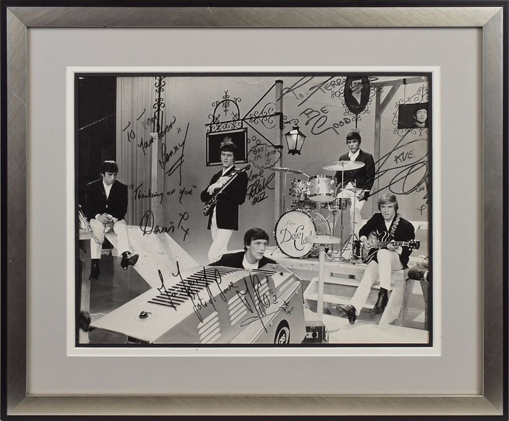 Vintage glossy 13.25 x 10.25 photo of the group performing on a set, inscribed in black felt tip to "Terry" and signed by all five members of the band, most using their first name only: Dave Clark, Mike Smith, Rick Huxley, Lenny Davidson, and Denis Payton. Triple-matted and framed to an overall size of 19.5 x 16. In very good condition, with noticeable scattered creasing and some smudging to signatures.