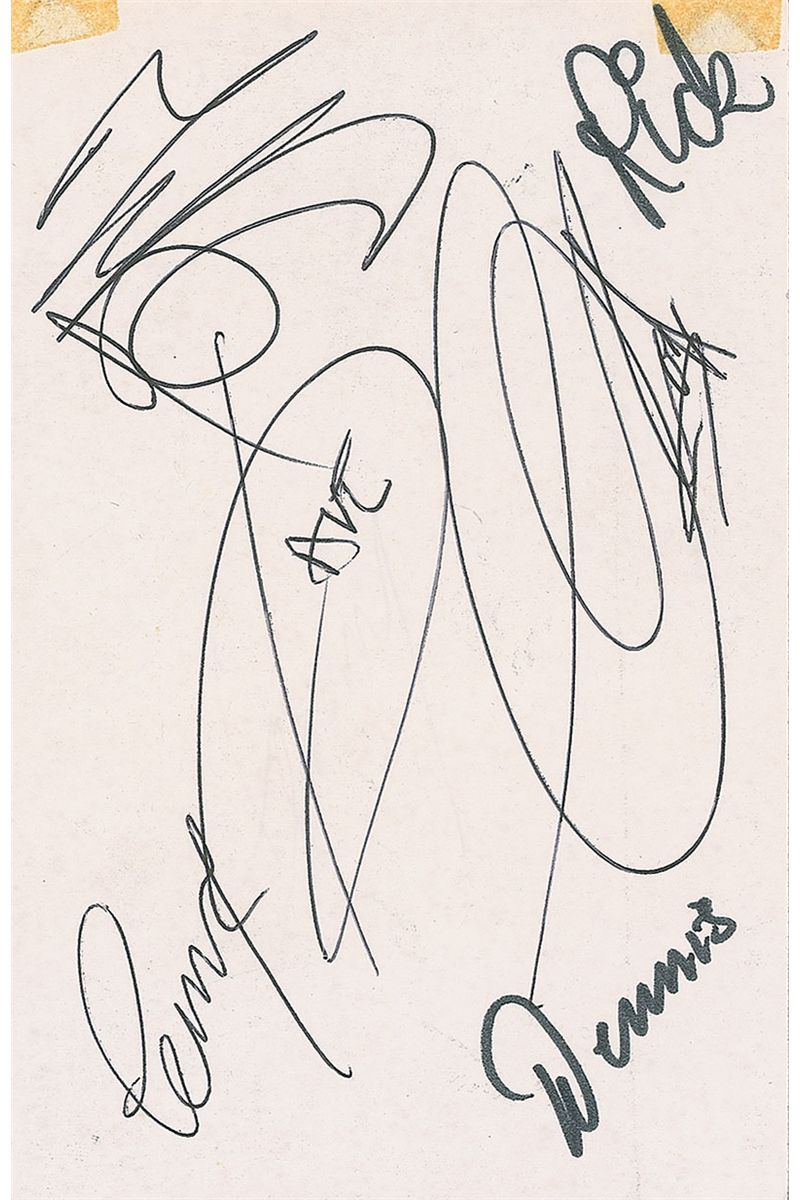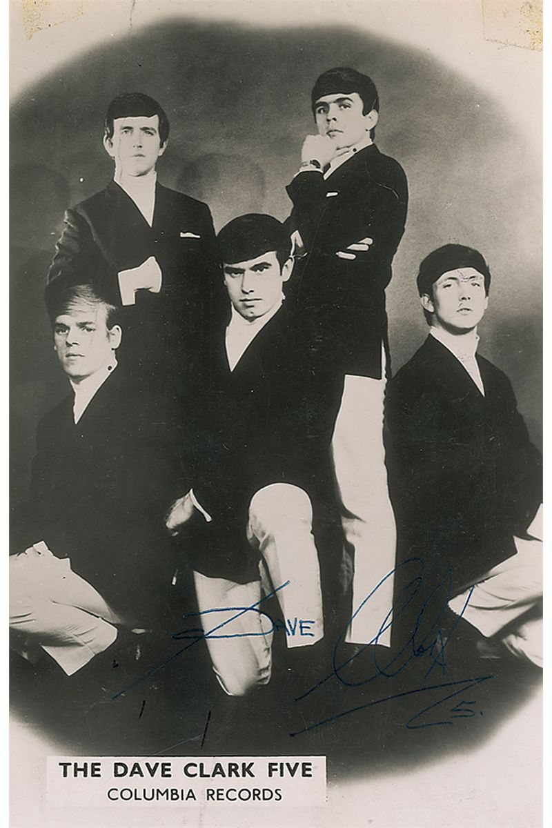 Vintage glossy 3.5 x 5.5 Columbia Records publicity photo, signed on the reverse in ballpoint and felt tip, “Dave Clark,” “Rick,” “Mike,” “Dennis,” and “Lenny.” Photo also bears a facsimile signature on the front. An unobtrusive diagonal crease and some toned tape remnants to corners, otherwise fine condition.