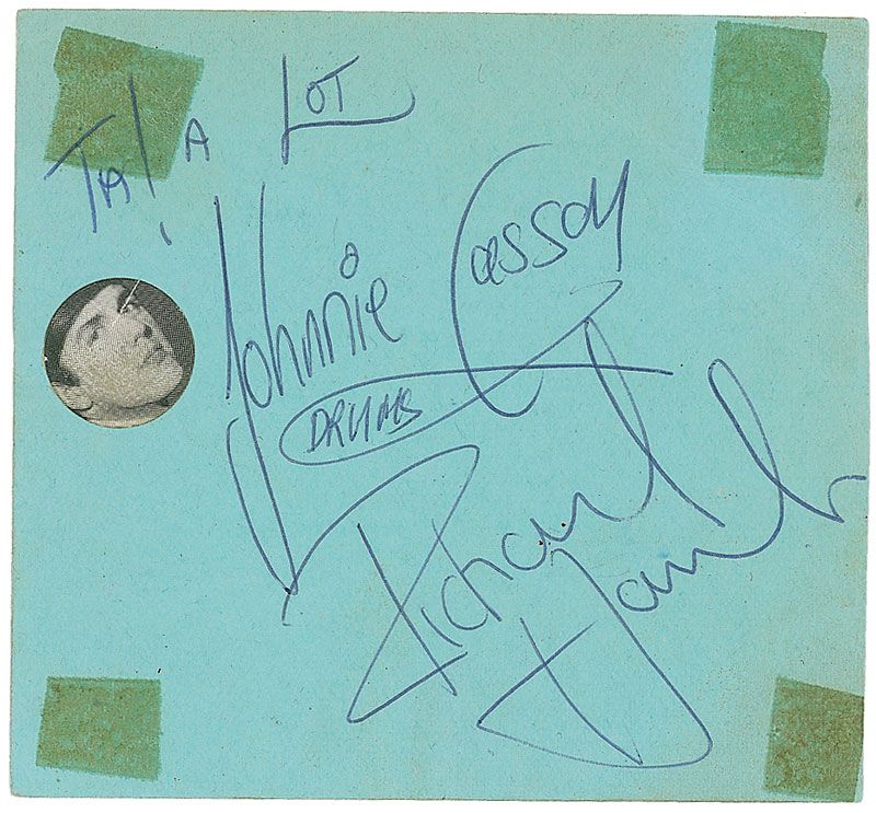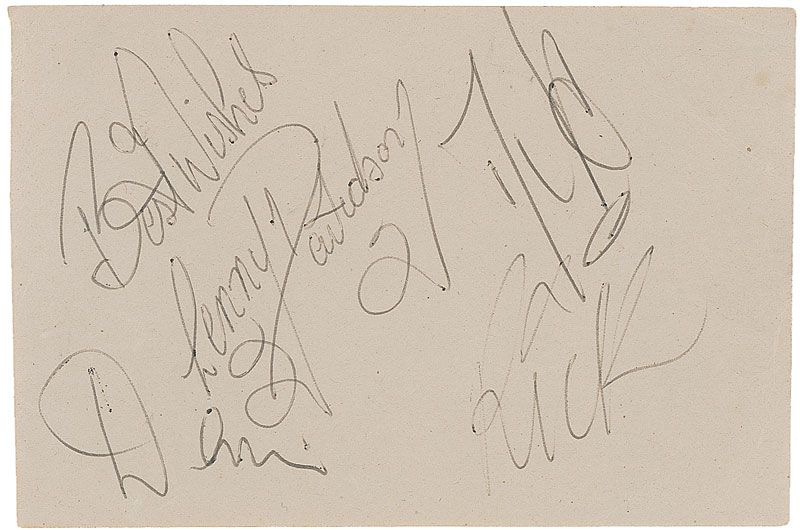 Vintage ballpoint signatures, “Dave Clark,” on a light blue 4.25 x 3.75 album page; and “Best wishes, Lenny Davidson,” “Rick,” “Mike,” and “Dennis,” on a beige 3.5 x 3 album page. Scattered toning and adhesive remnants to Clark’s page, otherwise fine condition.