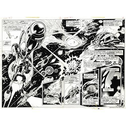 <B>Dave Cockrum and Sam Grainger - X-Men #97, Splash Page 2 and 3 Original Art (Marvel, 1976).</B></I> Hang on to your hats, X-fans -- 'cause here is the first, super-spectacular, double-page spread that Dave Cockrum created for the new X-Men team. If you include the <B>Giant-Size</B></I> book, this issue was but Cockrum's fifth issue featuring the new line-up. Professor X is haunted by strange dreams of a deep-space war in this cosmic scene from "My Brother, My Enemy," written by Chris Claremont. Don't miss out on two masterful pages of classic Bronze Age X-Men Dave Cockrum art, with senses-shattering inks by Sam Grainger. The combined image area of these pages measures approximately 10" x 21", and the art is in Excellent condition. <BR><BR><B>Important notice:</B> Heritage usually auctions material at the rate of 200-250 lots per hour. On some occasions eBay Live bid software or the Internet may not be able to keep up with the pace of the auction. We recommend placing a realistic absentee bid now as insurance to avoid disappointment. Occasionally the auctioneer may eliminate or reject an eBay Live bid, and the auctioneer may also reopen a lot after the close of the eBay live bidding (usually because we missed an audience bid), and may reject your bid even if it shows you as the winning bidder. By bidding via eBay Live, you agree that Heritage may award the lot to another bidder at its sole discretion under the circumstances described above or any other reasonable circumstances. Since eBay bids are not shown to us until we open the lot on the floor, we treat those bids just like floor bids. In most cases the floor responds before the eBay bid is presented to us, due to Internet lag time, so for consistency we have made it a policy that floor bids are always considered first over tie eBay live bids. Also please note that all Heritage lots purchased through eBay Live carry a 22.5% Buyer's Premium. Please make sure you read the Terms and Conditions before you bid. This lot is being auctioned in conjunction with a live floor auction by Heritage Auction Galleries. All final auction and invoice information will be supplied by Heritage Auction Galleries, and all other information should be considered preliminary. Lot:41001 <BR><BR><B>Winning Notification and Billing:</B> After the FINAL session in this auction is complete, Heritage will send e-mail and snail mail invoices. This process normally takes several days. All final auction and invoice information will be supplied by Heritage Auction Galleries, and all other information should be considered preliminary. <BR><BR>This auction will be conducted on a live auction floor and over the Internet through eBay Live. If you choose to place an absentee bid, please take a moment to <font color='#0000ff'><u><a href='http://pages.ebay.com/liveauctions/help/before/laabsentee.html'>learn how eBay Live absentee bidding works</a></u></font><font color='#000000'>