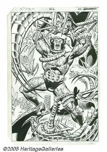 <B>Dave Cockrum and Bob Wiacek - The Uncanny X-Men #162, Splash Page 20 Original Art (Marvel, 1982).</B></I> On the homeworld of the Brood, Wolverine's adamantium skeleton and healing factor keep him going while he trashes a blood-thirsty host of Brood drones, in this venomous splash page by Dave Cockrum. This issue was voted by fans as among the "100 Greatest Marvels of All Time," coming in at #72. Cockrum fills this single panel page to capacity with one of X-fandom's faves taking on a group of malignant monstrosities from Chris Claremont's lethal storyline, "Beyond the Farthest Star." The image area measures 10" x 15", and aside from the trimmed corners (created during the production process), the art is in Excellent condition.