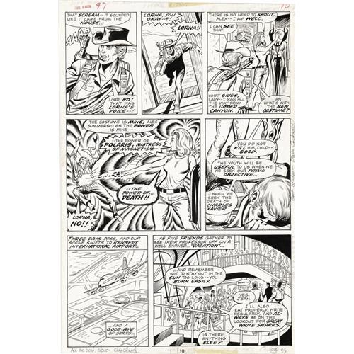 <B>Dave Cockrum and Sam Grainger - X-Men #97, page 10 Original Art (Marvel, 1976).</B></I> Alex Summers gets a taste of the deadly power of Polaris, Mistress of Magnetism, in this power-packed page from the Chris Claremont saga, "My Brother, My Enemy." Lorna Dane is only blasting her lover because she's been placed under the hypnotic control of Eric the Red. As a wonderful, added "art bonus," on the back of this superb page is a decidedly delightful pencil sketch of the pulchritudinous Polaris, signed in pen by Dave Cockrum. The image area of this Marvel masterwork measures 10" x 15", and the art is in Excellent condition. The front of this page was signed by Chris Claremont and Dave Cockrum. <BR><BR><B>Important notice:</B> Heritage usually auctions material at the rate of 200-250 lots per hour. On some occasions eBay Live bid software or the Internet may not be able to keep up with the pace of the auction. We recommend placing a realistic absentee bid now as insurance to avoid disappointment. Occasionally the auctioneer may eliminate or reject an eBay Live bid, and the auctioneer may also reopen a lot after the close of the eBay live bidding (usually because we missed an audience bid), and may reject your bid even if it shows you as the winning bidder. By bidding via eBay Live, you agree that Heritage may award the lot to another bidder at its sole discretion under the circumstances described above or any other reasonable circumstances. Since eBay bids are not shown to us until we open the lot on the floor, we treat those bids just like floor bids. In most cases the floor responds before the eBay bid is presented to us, due to Internet lag time, so for consistency we have made it a policy that floor bids are always considered first over tie eBay live bids. Also please note that all Heritage lots purchased through eBay Live carry a 22.5% Buyer's Premium. Please make sure you read the Terms and Conditions before you bid. This lot is being auctioned in conjunction with a live floor auction by Heritage Auction Galleries. All final auction and invoice information will be supplied by Heritage Auction Galleries, and all other information should be considered preliminary. Lot:41001 <BR><BR><B>Winning Notification and Billing:</B> After the FINAL session in this auction is complete, Heritage will send e-mail and snail mail invoices. This process normally takes several days. All final auction and invoice information will be supplied by Heritage Auction Galleries, and all other information should be considered preliminary. <BR><BR>This auction will be conducted on a live auction floor and over the Internet through eBay Live. If you choose to place an absentee bid, please take a moment to <font color='#0000ff'><u><a href='http://pages.ebay.com/liveauctions/help/before/laabsentee.html'>learn how eBay Live absentee bidding works</a></u></font><font color='#000000'>