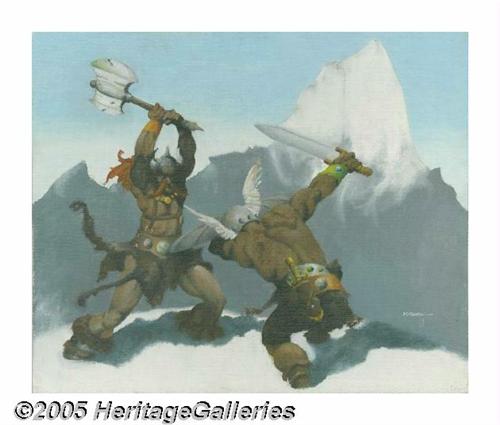 <B>Dave Dorman - Barbarians in Combat Fantasy Painting Original Art (1986).</B></I> Best known for his wonderful paintings illustrating the "Star Wars" universe, Dave Dorman is one of the world's leading science-fiction/fantasy artists. This early painting, according to Dorman, "was based on a small Frank Frazetta pen sketch and was done at a time in my youth when I was teaching myself how to paint." This is a terrific piece that showcases Dorman's early promise. Measuring approximately 24" x 20" overall, this piece is in Excellent condition and is signed by the artist at the lower right.