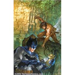 Dave Dorman - Original Cover Painting for Batman/Tarzan: Claws of the Cat-Woman #1 (Darkhorse/DC, 1999). Artist extraordinaire Dave Dorman aptly handles the reins of this magnificent rendering of two of fantasy's greatest heroes, Batman and Tarzan, in the first of a four-part series. This first cover, painted in oil, is a perfect blend of fantasy and reality set deep in a lush jungle undergrowth. Dorman achieves an incredible level of realism, loading his palette with emeralds, aquamarines and rich blues. A sliver of sunlight breaks through the canopy and splashes on the wall behind Tarzan. You have to see this cover to realize how exquisite this work is. Image size is 11' x 17". Important notice: We expect to be auctioning lots at the rate of 200-250 per hour. Sometimes eBay Premier live bid software cannot keep up with that pace, so we strongly recommend that you place a realistic proxy bid now as insurance to avoid disappointment. Also please note that all Heritage/CAA lots purchased through eBay Premier carry a 20% Buyer's Premium. Please make sure you read the Terms and Conditions.