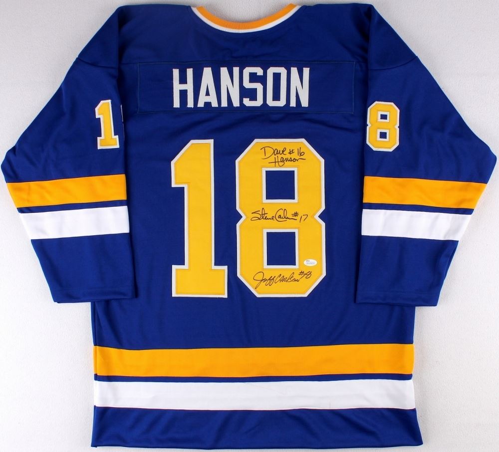 Custom on-ice style jersey. Everything sewn on, size XL. Hand-signed in black felt-tip pen by Dave Hanson, Steve Carlson, and Jeff Carlson. The autograph includes an official James Spence Authentication (JSA) hologram and matching COA for authenticity purposes. The signing of this item was witnessed by JSA.