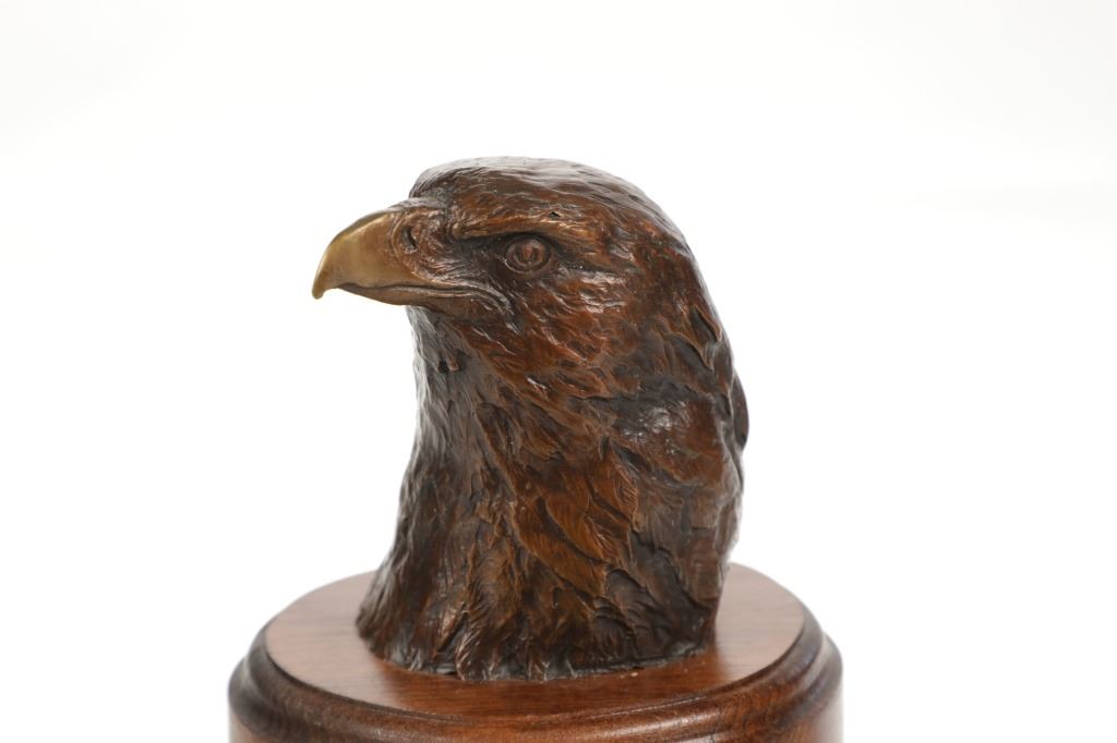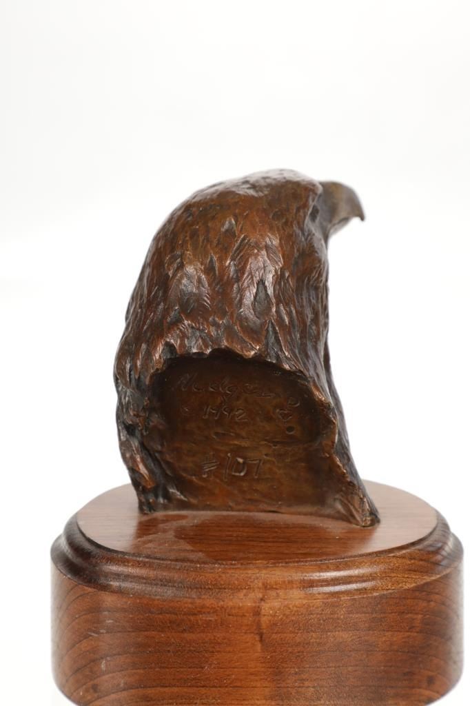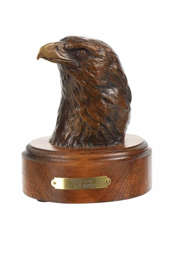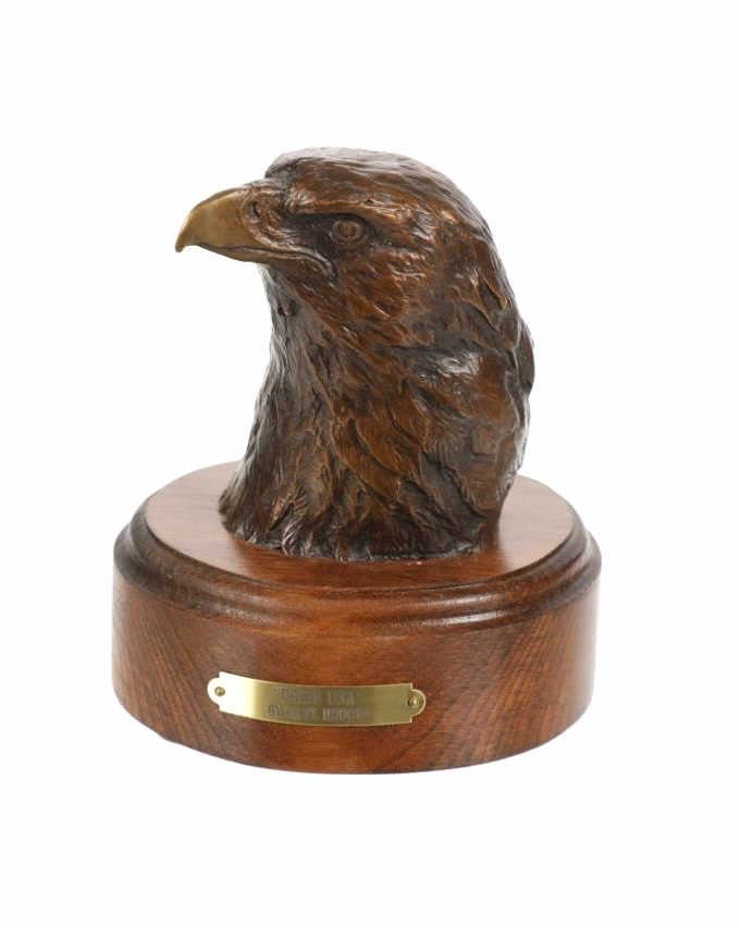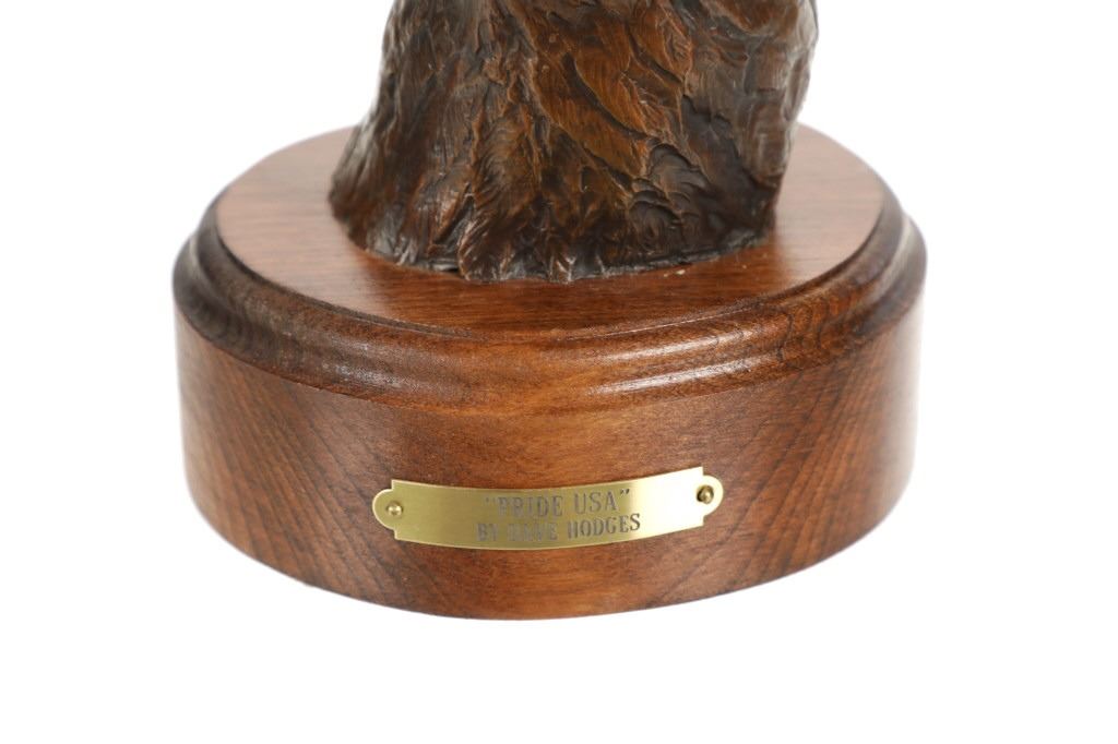 For your consideration is this bronze sculpture titled, "Pride USA," by Montana artist Dave Hodges circa 1992. This is a bronze sculpture of a eagles head that shows wonderful attention to detail and is inscribed with: Hodges - 1992 - #107 and features the artist hallmark. The sculpture is mounted on a hardwood shield that features a plaque that reads: "Pride USA" by Dave Hodges. Dave Hodges, a Big Timber Montana artist, graduated from MSU in 1979. In 1982, he began his professional career as a bronze sculptor and continues successfully in that field to this time. The condition of this bronze is good with no obvious signs of damage and in good overall condition. The measurements of this bronze are 4" L x 4 1/2" W x 5 1/2" H.