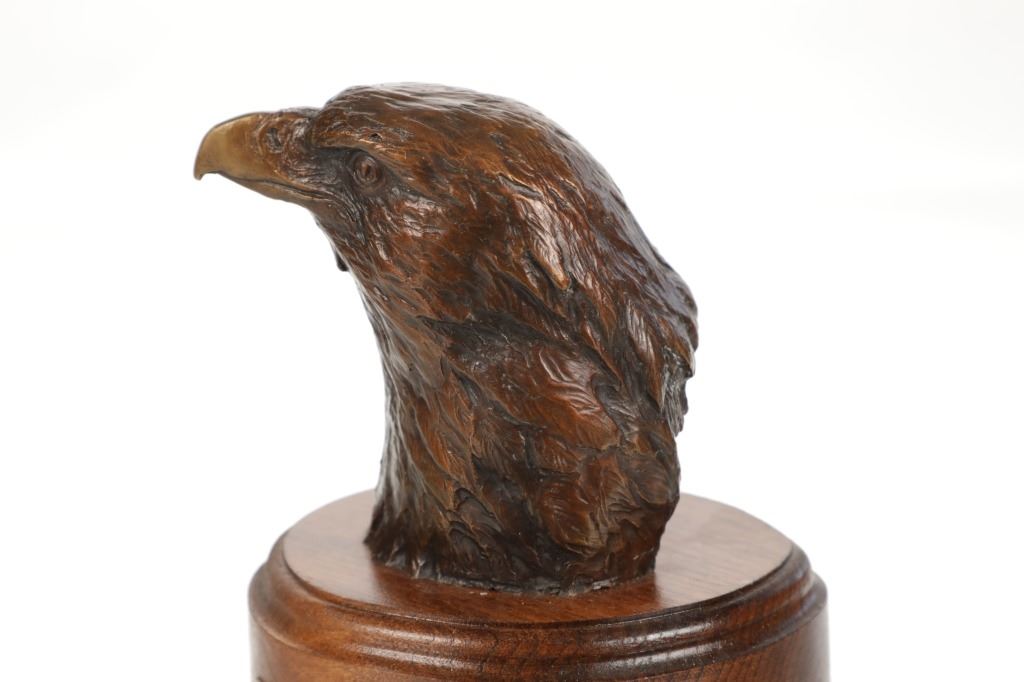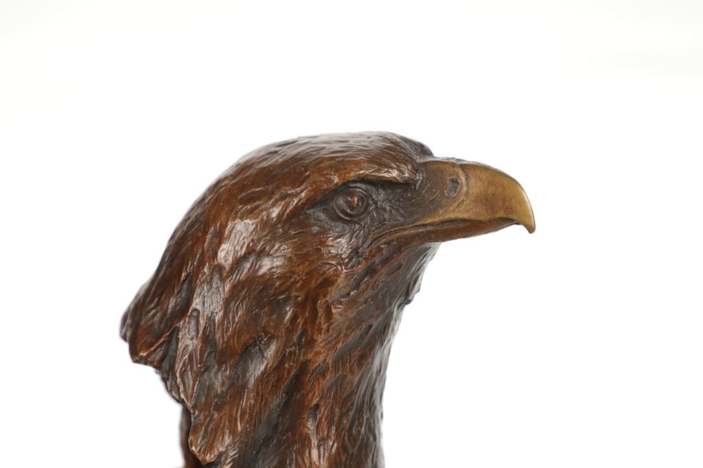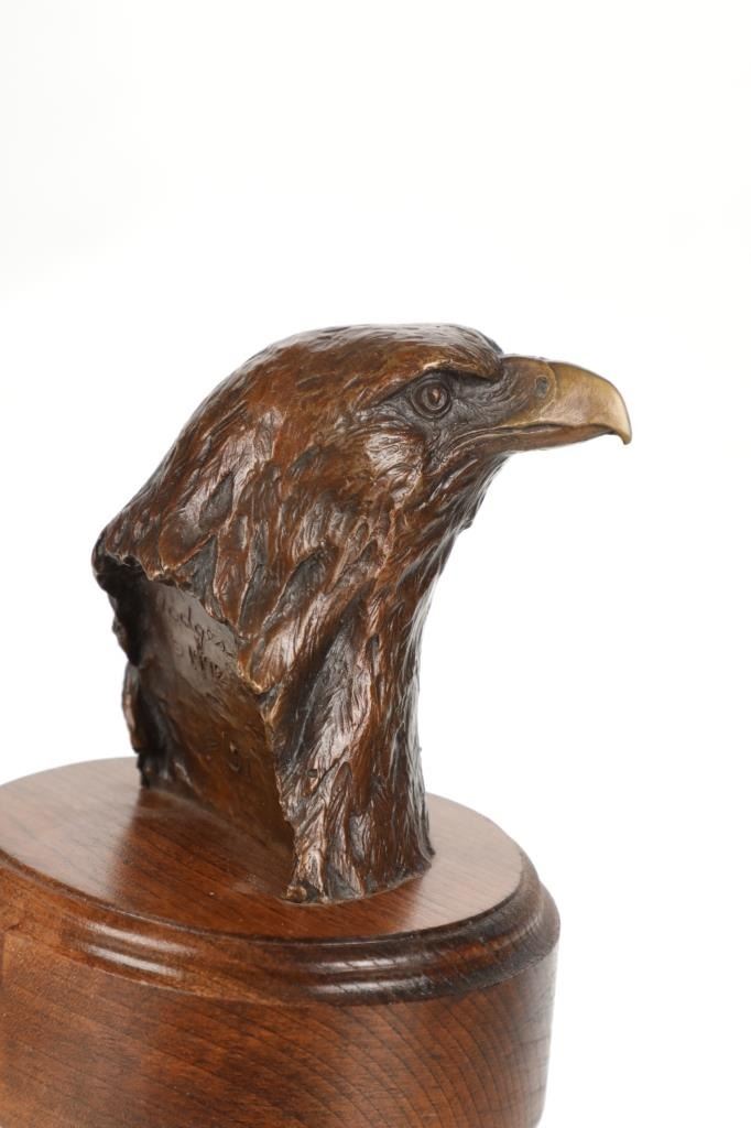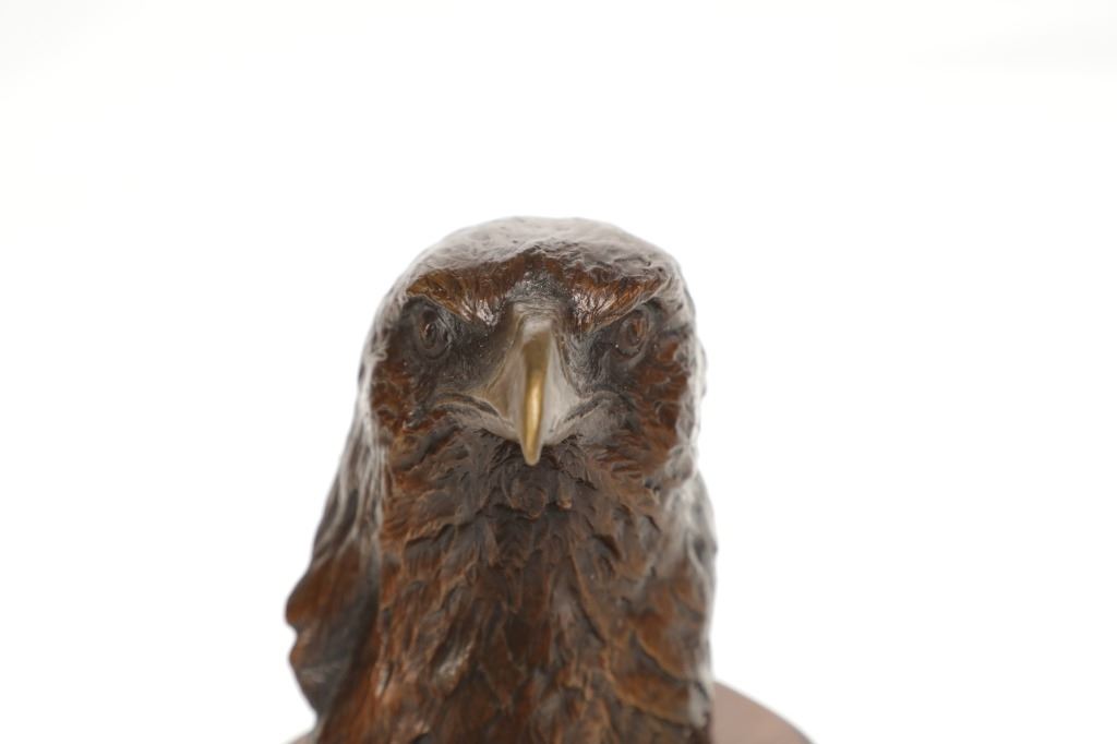 For your consideration is this bronze sculpture titled, "Pride USA," by Montana artist Dave Hodges circa 1992. This is a bronze sculpture of a eagles head that shows wonderful attention to detail and is inscribed with: Hodges - 1992 - #107 and features the artist hallmark. The sculpture is mounted on a hardwood shield that features a plaque that reads: "Pride USA" by Dave Hodges. Dave Hodges, a Big Timber Montana artist, graduated from MSU in 1979. In 1982, he began his professional career as a bronze sculptor and continues successfully in that field to this time. The condition of this bronze is good with no obvious signs of damage and in good overall condition. The measurements of this bronze are 4" L x 4 1/2" W x 5 1/2" H.