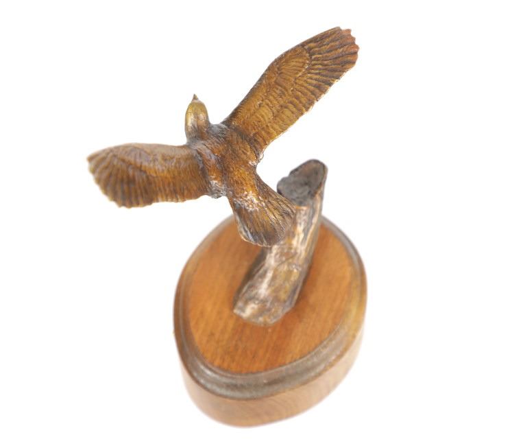 Featured in this lot is this bronze sculpture titled, "Golden Descent" by Montana artist Dave Hodges, born in 1949 and circa 1991. This bronze sculpture features a bald eagle on a branch and is mounted on a hardwood shield with a plaque that reads as follows: "Golden Descent" by Dave Hodges. The bronze is inscribed with 92/100 - 1991 - Hodges and shows the artist hallmark next to the copyright symbol. Dave Hodges, a Big Timber, Montana artist, graduated from MSU in 1979. In 1982, he began his professional career as a bronze sculptor and continues successfully in that field to this time. The condition of this bronze is good with no obvious signs of damage and in good overall condition. The measurements of this bronze are 3 1/2" L x 5" W x 6 1/2" H. The collective weight of this bronze sculpture is 14oz.