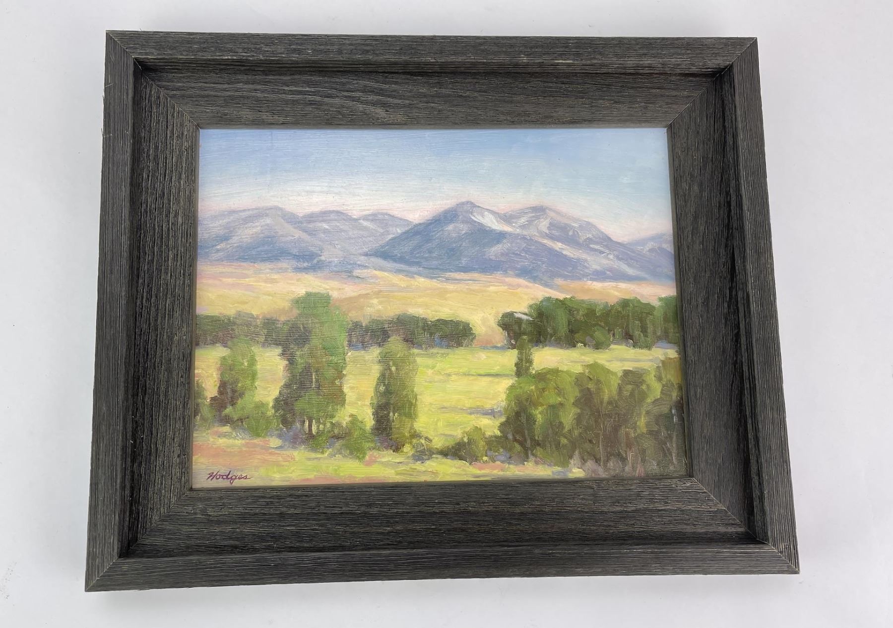 9"x12" unframed, 12.5" by 15.5" framed. Title is Summer Morning. BACKGROUND Dave Hodges graduated with a Bachelor of Science degree from Montana State University, Bozeman, Montana in 1979. He began sculpting as a career in 1982 and has been commissioned to create sculptures for several large corporations as gifts to their international clients. Articles on his work have been published in Southwest Art , Western Horseman, and Texas Longhorn Trails magazines. Dave is also an oil painter of landscapes of the western region and is a founding member of the Montana Painters Alliance, Painters of the Big Sky, and a member of the Montana Professional Artists Association. AWARDS & RECOGNITION His work has received awards at the following shows: Willamette Western Art Show, Salem, OR; American National Miniature Show, Laramie, WY; Western Regional Art Show, Cheyenne, WY; National Miniature Show, La Luz, NM. He created a bust of past director of flight operations for the Northwest Airline Flight Training Center in Minneapolis, and a bust of international opera star, Marilyn Horne, for the Bradford Branch of the University of Pittsburgh. His life-size statue of a running horse, Free Spirit, permanently enhances the City Park in Big Timber, Montana. A private commission life-size statue of a cow and calf can also be seen in Big Timber, Montana. He was chosen by the Montana Arts Council to make the White House Christmas tree ornament for the State of Montana in 2002. The sculpture Fancy Footwork, owned by former President Ronald Reagan, is permanently displayed at the Ronald Reagan Presidential Library and Museum in Simi Valley, CA, and is featured in the library brochure. EXHIBITIONS & SHOWS His horse sculptures have been exhibited through several American Academy of Equine Artists shows, most recently the Wild Horses exhibit at the Wildlife Experience in Parker, CO in Jan. 2003 and Jan. 2004.