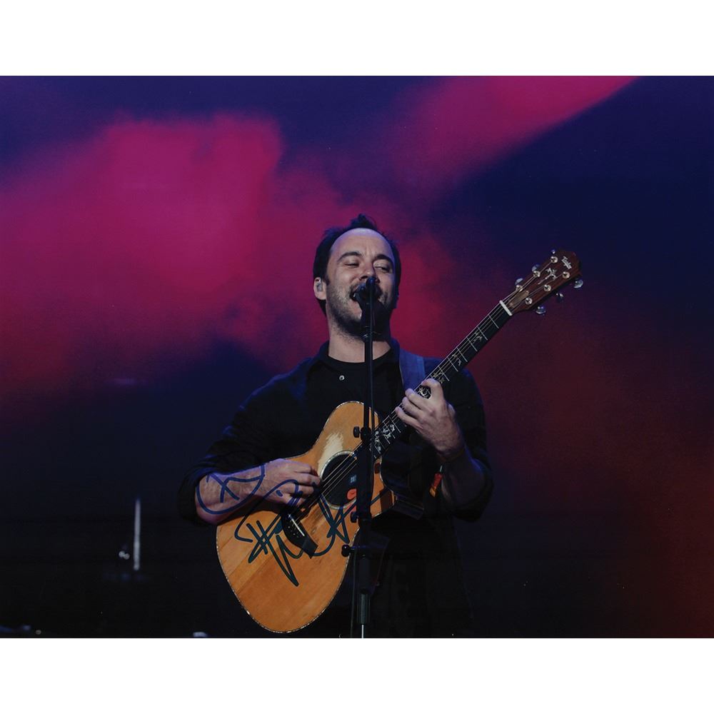 Color satin-finish 14 x 11 photo of Dave Matthews singing and strumming his acoustic guitar on stage, signed in blue felt tip. In very fine condition.