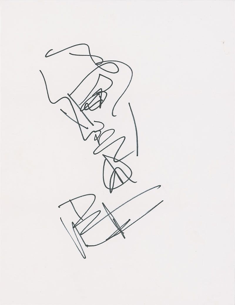 Original signed felt tip sketch of a man’s face and a peace symbol on an off-white 8.5 x 11 sheet. In fine condition.
