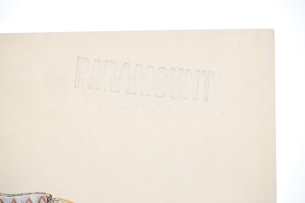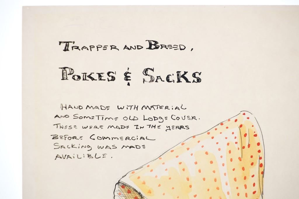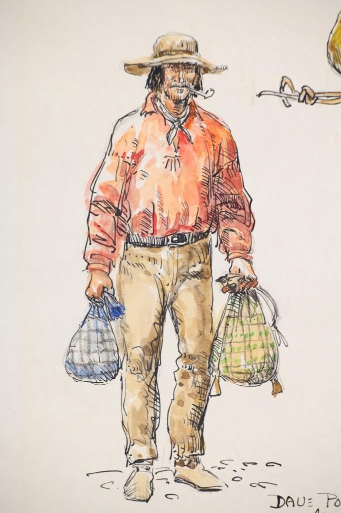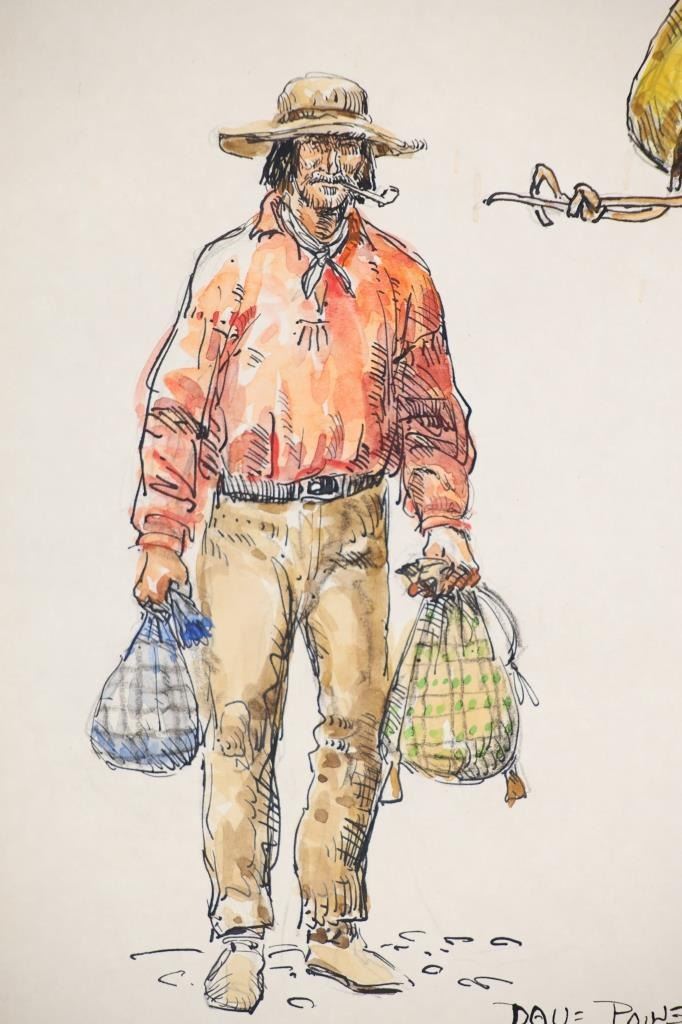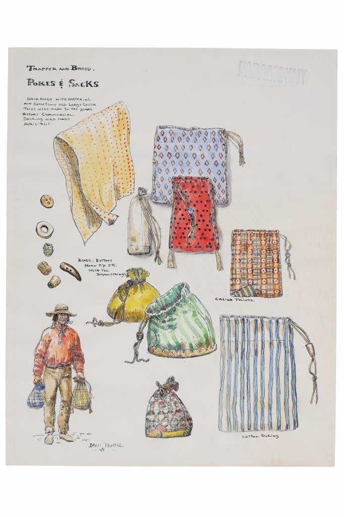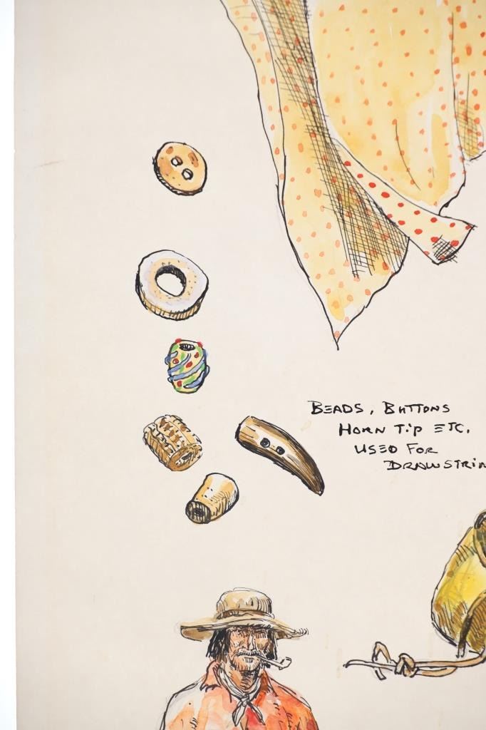 Featured in this lot is this STAMPED Paramount movie costume pitch sketchbook artwork in an ink and watercolor medium by Dave Powell CAA artist and son of Ace Powell. The sketchbook artwork features a wonderfully and professionally crafted ink and watercolor construction that shows the finished product in the bottom left hand corner with the trappers adornments and garments shown seperate to the right of the artwork. The sketchbook movie pitch is marked and labeled as follows: Trapper and Breed - Pokes & Sacks - Handmade with material and sometime old lodge cover. These were made in the years before commercial sacking was made available. - Beads, Buttons horn tip Etc. used for drawstrings - Calico Prints - Cotton Ticking - Dave Powell (his star hallmark). The sketchbook movie costume pitch is stamped with a Paramount stamp in the top right hand corner. Dave Powell (born 1954) is a contemporary Western artist rooted deeply in Montana, with four generations of family heritage tied to the region’s rugged landscape and cowboy culture. The son of artists Ace Powell and Nancy McLaughlin Powell, Dave inherited a rich artistic lineage. Primarily self-taught, Dave began serious art training in his mid-teens. He benefited from mentorship and collaboration with celebrated Western artists, including Bob Scriver, Ned Jacob, Robert Lougheed, and Joe Beeler, the founder of the Cowboy Artists of America (CAA). Dave Powell’s deep knowledge of historical Western clothing and gear led him to work with Paramount Pictures, where he pitched and advised on authentic movie costumes. Drawing on his expertise in cowboy and Native American attire, he helped ensure the wardrobe designs accurately reflected the period, adding realism and credibility to the studio’s Western productions. The condition of this sketchbook movie pitch is well preserved with no obvious signs of damage with some browning to the paper but otherwise shows a well preserved overall condition. The measurements of this sketchbook pitch is 14" x 11". The collective weight of this sketchbook movie pitch is U4oz.,