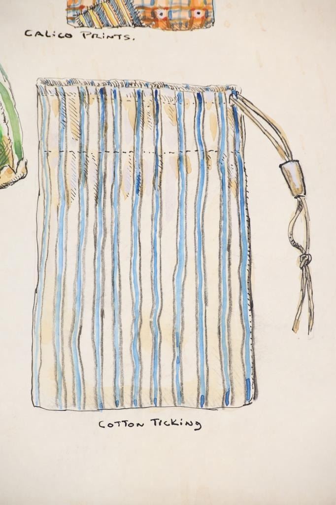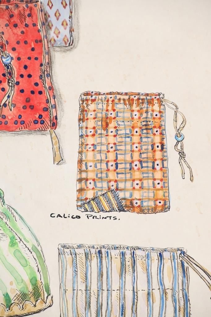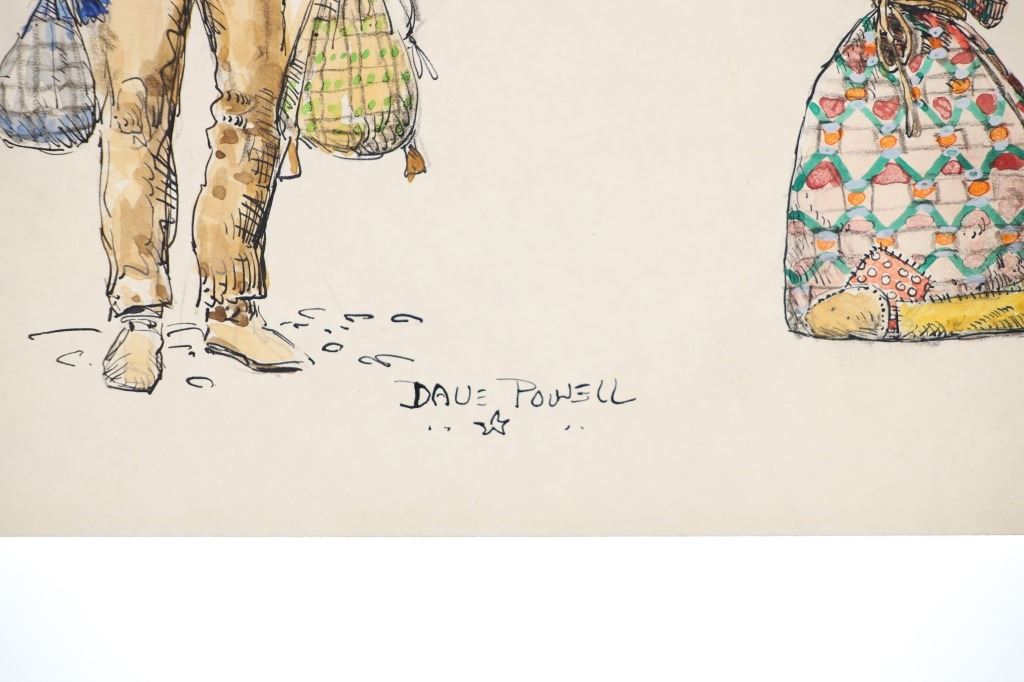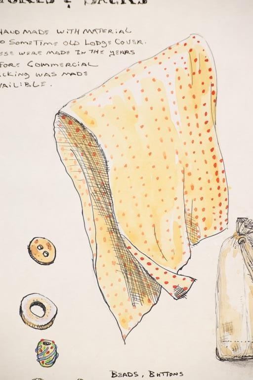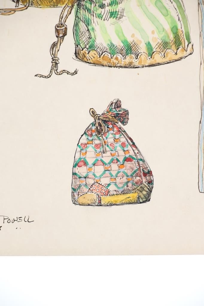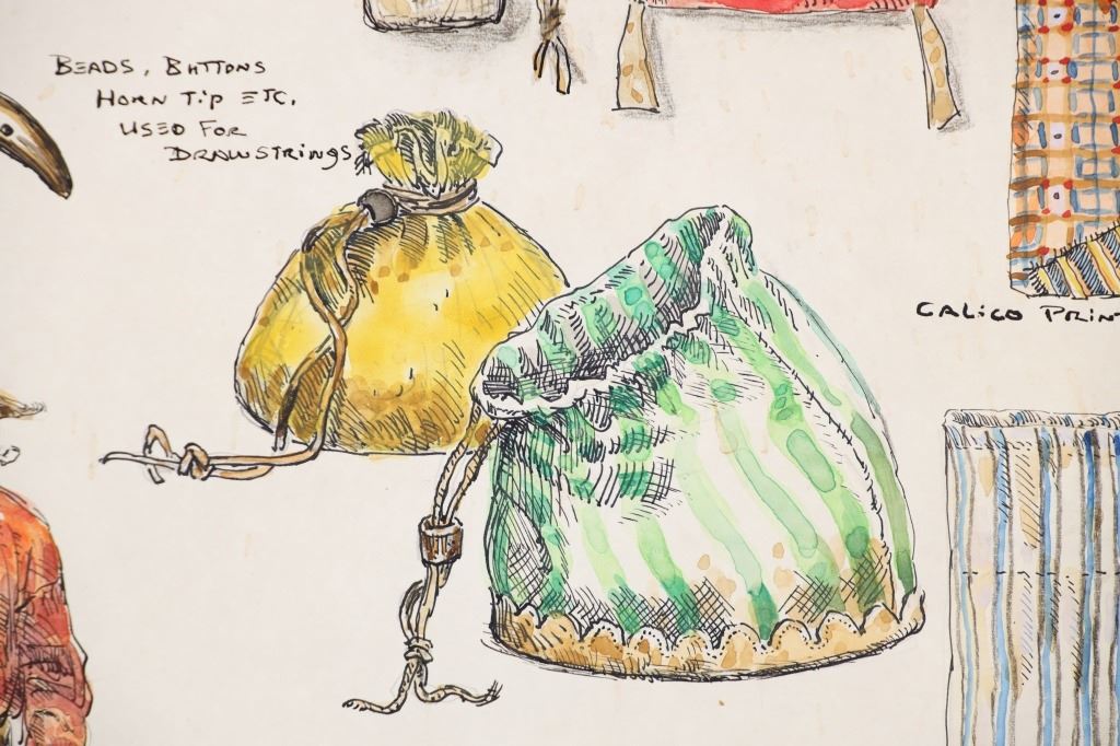 Featured in this lot is this STAMPED Paramount movie costume pitch sketchbook artwork in an ink and watercolor medium by Dave Powell CAA artist and son of Ace Powell. The sketchbook artwork features a wonderfully and professionally crafted ink and watercolor construction that shows the finished product in the bottom left hand corner with the trappers adornments and garments shown seperate to the right of the artwork. The sketchbook movie pitch is marked and labeled as follows: Trapper and Breed - Pokes & Sacks - Handmade with material and sometime old lodge cover. These were made in the years before commercial sacking was made available. - Beads, Buttons horn tip Etc. used for drawstrings - Calico Prints - Cotton Ticking - Dave Powell (his star hallmark). The sketchbook movie costume pitch is stamped with a Paramount stamp in the top right hand corner. Dave Powell (born 1954) is a contemporary Western artist rooted deeply in Montana, with four generations of family heritage tied to the region’s rugged landscape and cowboy culture. The son of artists Ace Powell and Nancy McLaughlin Powell, Dave inherited a rich artistic lineage. Primarily self-taught, Dave began serious art training in his mid-teens. He benefited from mentorship and collaboration with celebrated Western artists, including Bob Scriver, Ned Jacob, Robert Lougheed, and Joe Beeler, the founder of the Cowboy Artists of America (CAA). Dave Powell’s deep knowledge of historical Western clothing and gear led him to work with Paramount Pictures, where he pitched and advised on authentic movie costumes. Drawing on his expertise in cowboy and Native American attire, he helped ensure the wardrobe designs accurately reflected the period, adding realism and credibility to the studio’s Western productions. The condition of this sketchbook movie pitch is well preserved with no obvious signs of damage with some browning to the paper but otherwise shows a well preserved overall condition. The measurements of this sketchbook pitch is 14" x 11". The collective weight of this sketchbook movie pitch is U4oz.,