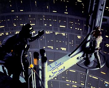 Darth Vader, real name Anakin Skywalker, is the main character of the Star Wars saga, appearing as the main antagonist of the original trilogy and the main protagonist of the prequel trilogy. This 16x20 Photo from Star Wars Episode V - The Empire Strikes Back from the pivotal "I am your father" scene was personally signed by Dave Prowse, the actor that played Darth Vader in the original Star Wars Movies with "Darth Vader" inscription. Steiner Sports Hologram and Certificate of Authenticity.