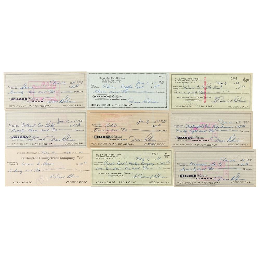 Hall of Fame linebacker (born 1941) for the Green Bay Packers and Washington Redskins, and two-time Super Bowl champion (I and II). Nine personal checks signed by Green Bay Packers legend Dave Robinson, dated from 1964 to 1973, each filled out and signed by Robinson. Includes six signed "Dave Robinson" and three signed "R. David Robinson." In fine condition.