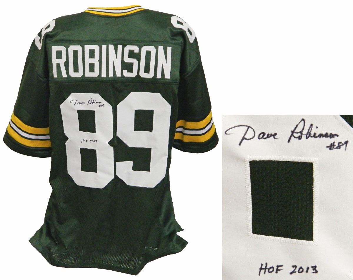 Dave Robinson signed green throwback custom football jersey with 'HOF 2013' inscription. Item comes with a Schwartz Sports Memorabilia tamper-proof numbered hologram and Certificate of Authenticity which can be verified online.