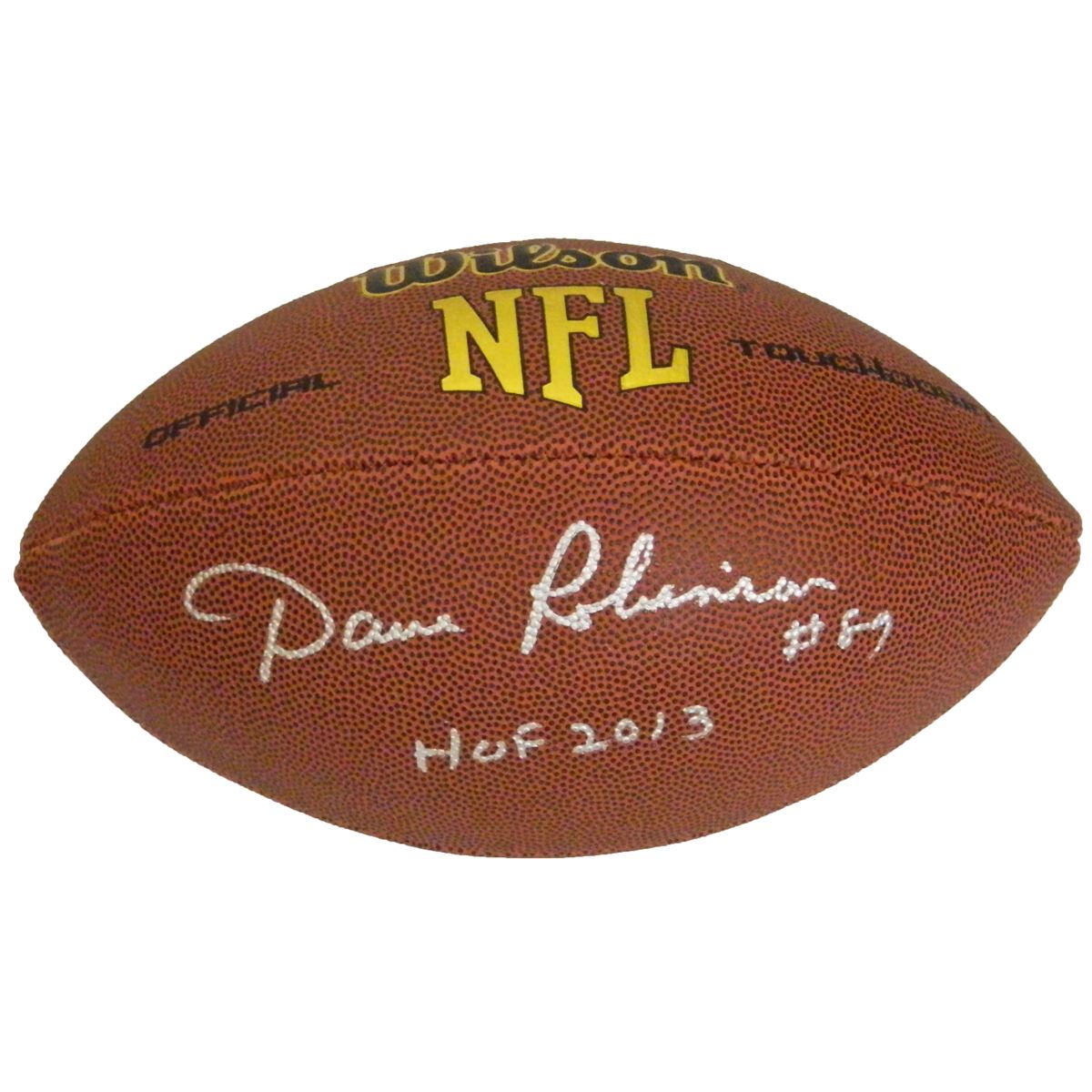 Dave Robinson signed Wilson Touchdown NFL full size football with 'HOF 2013' inscription. Item comes with a Schwartz Sports Memorabilia tamper-proof numbered hologram and Certificate of Authenticity which can be verified online.