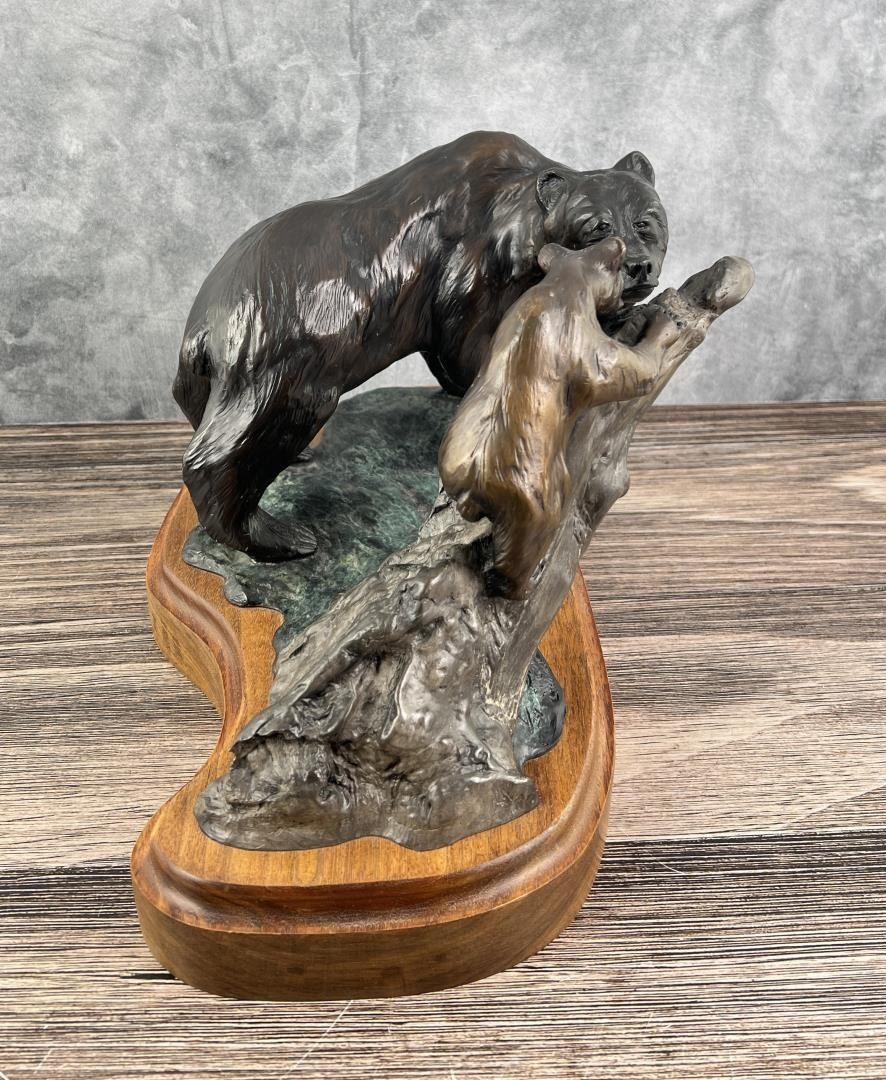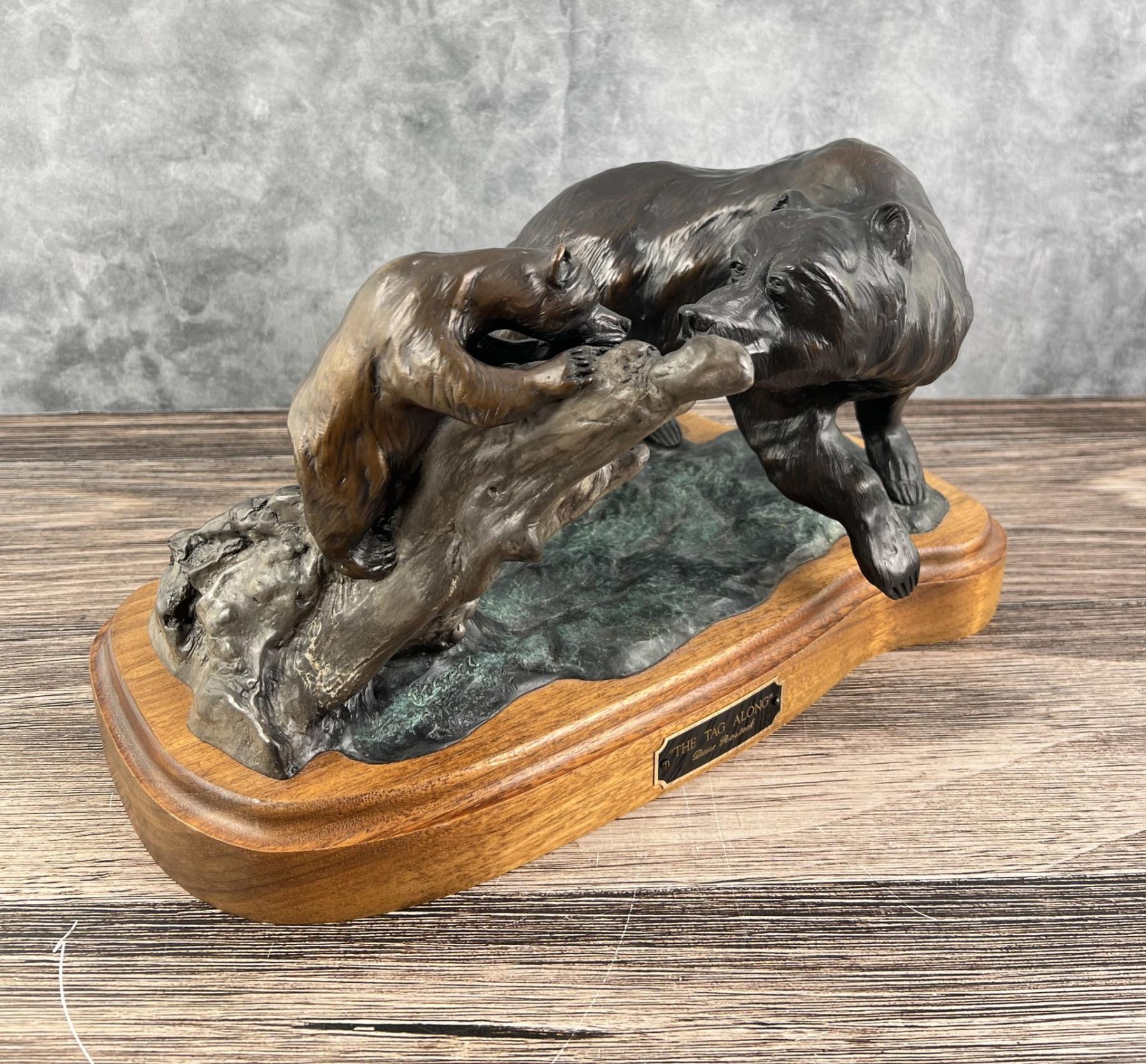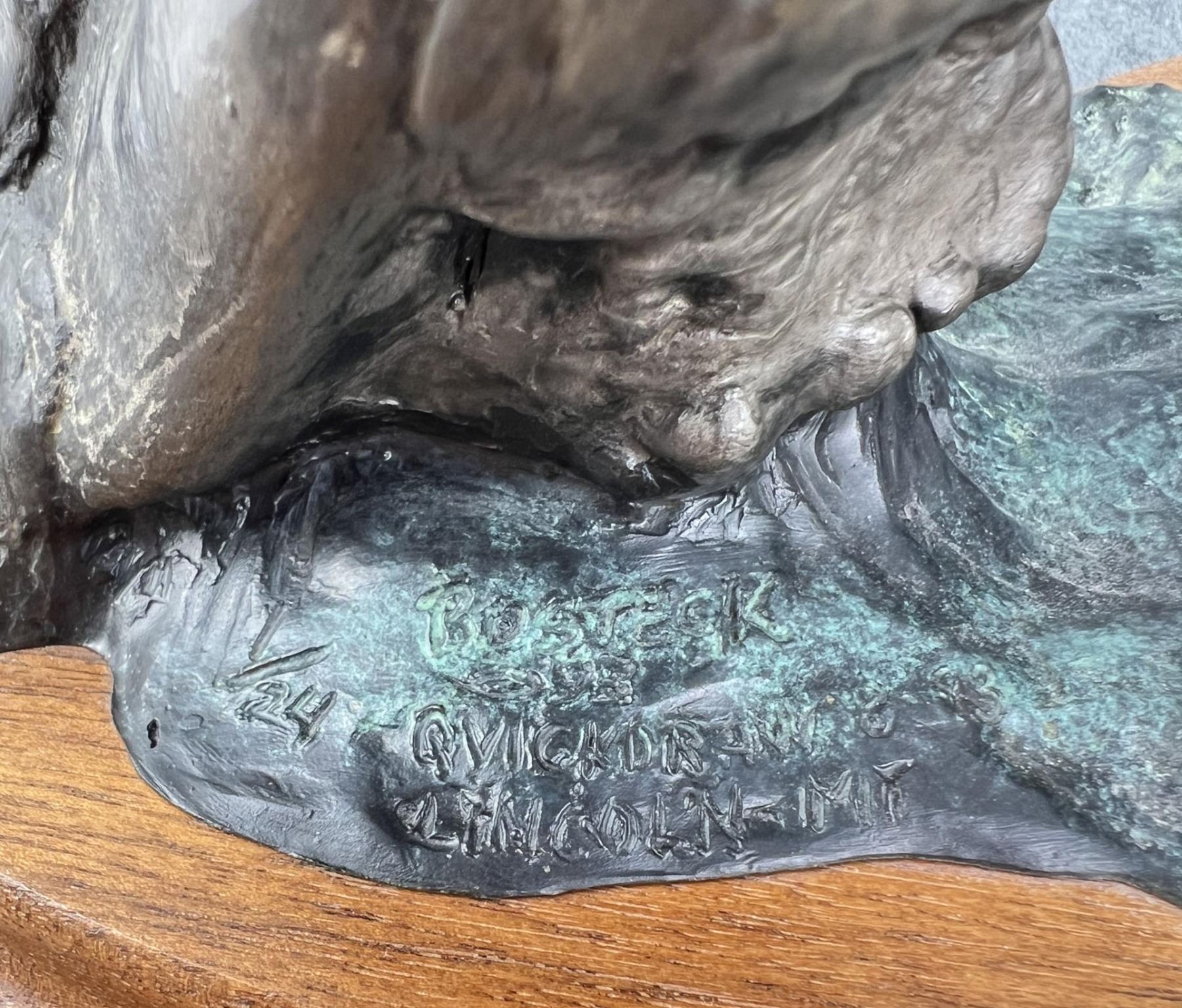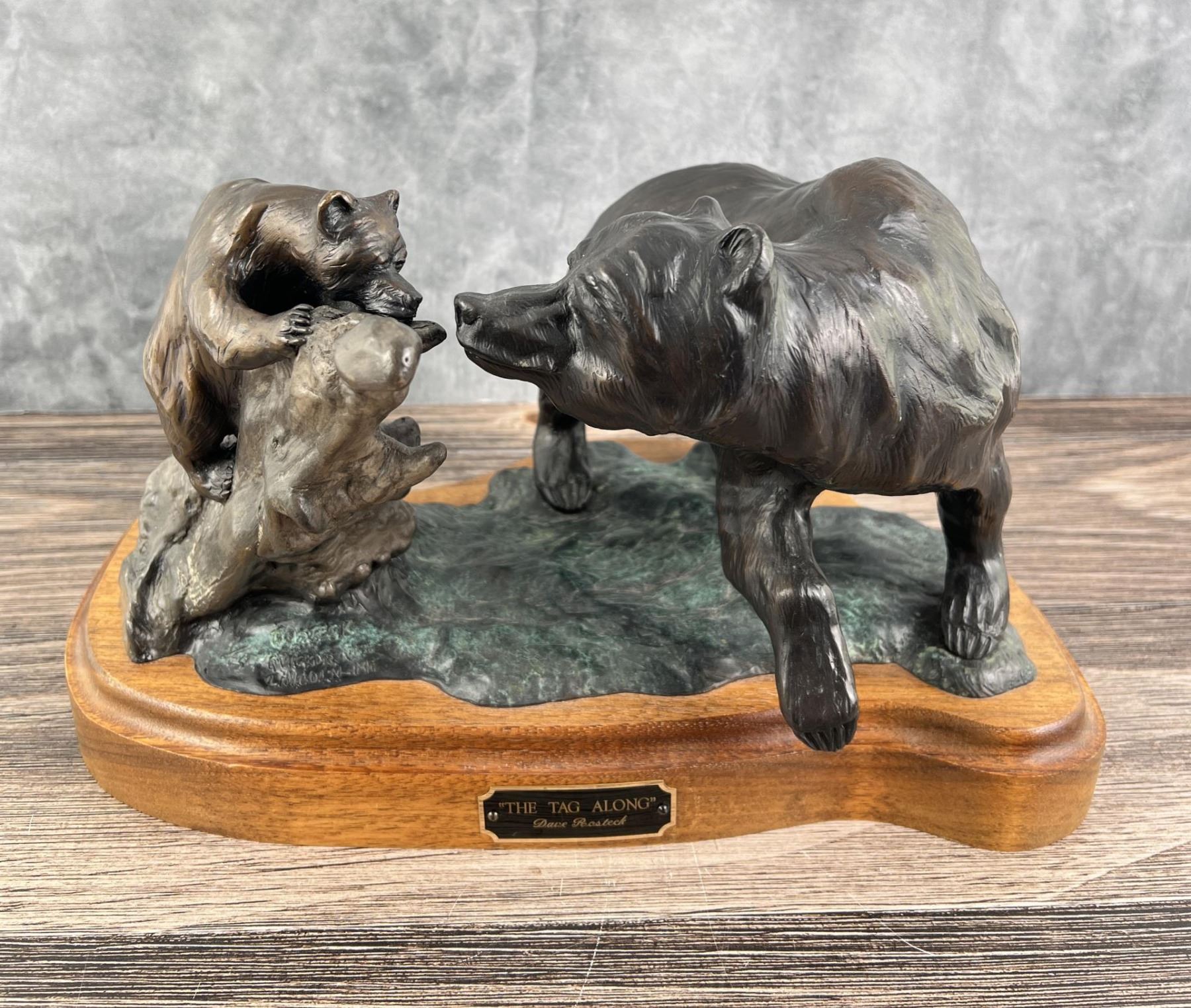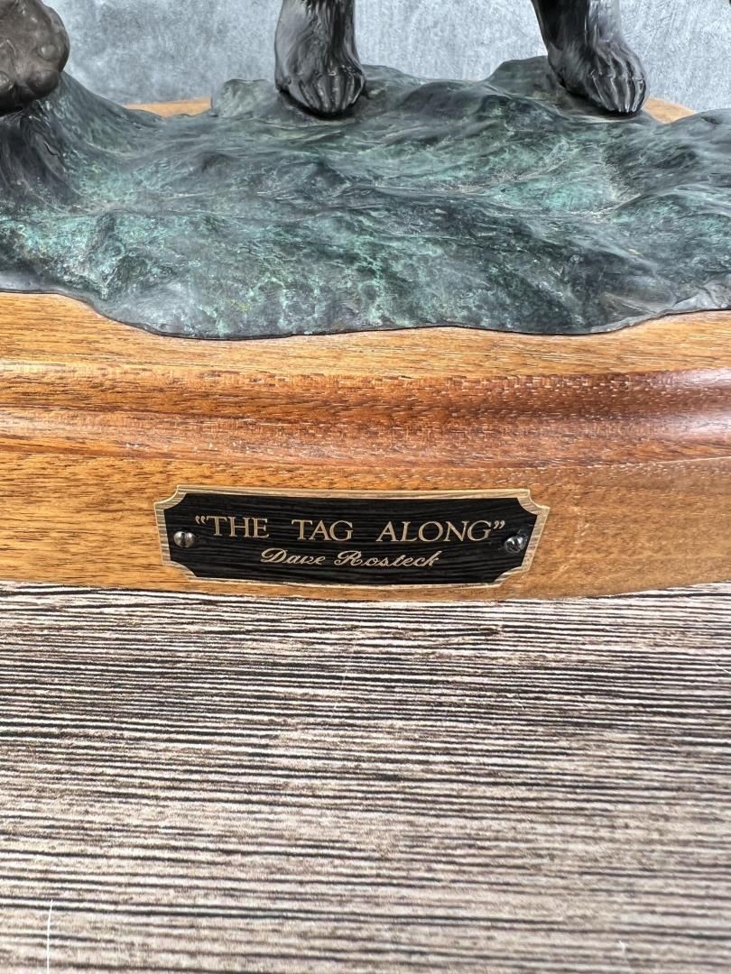 Title is The Tag Along. 15" by 10 1/2" by 9 1/4". Dave Rosteck (20th century) was active/lived in Montana. Dave Rosteck is known for Sculptor-wildlife. A resident of Great Falls, Montana, he has been a long-time participant in the C.M. Russell Auction. When he was in the fifth grade, one of his wire sculptures was displayed at the Russell Museum.