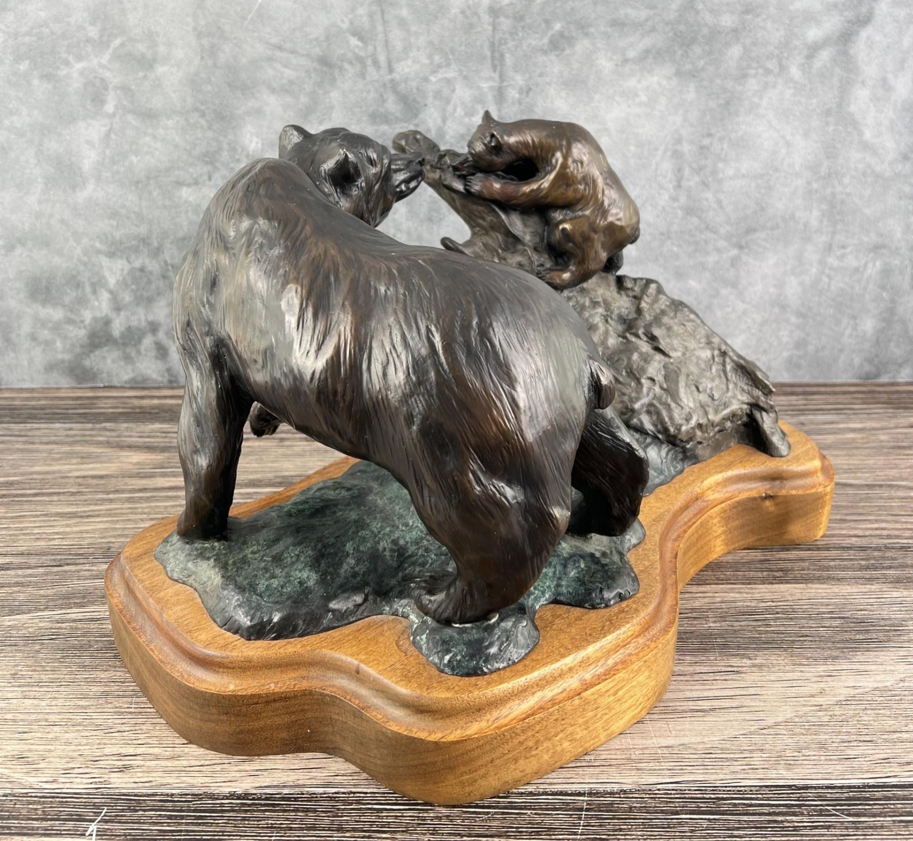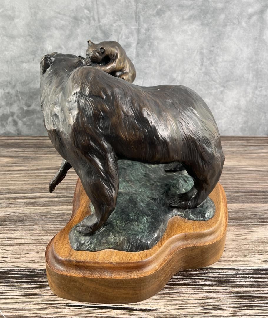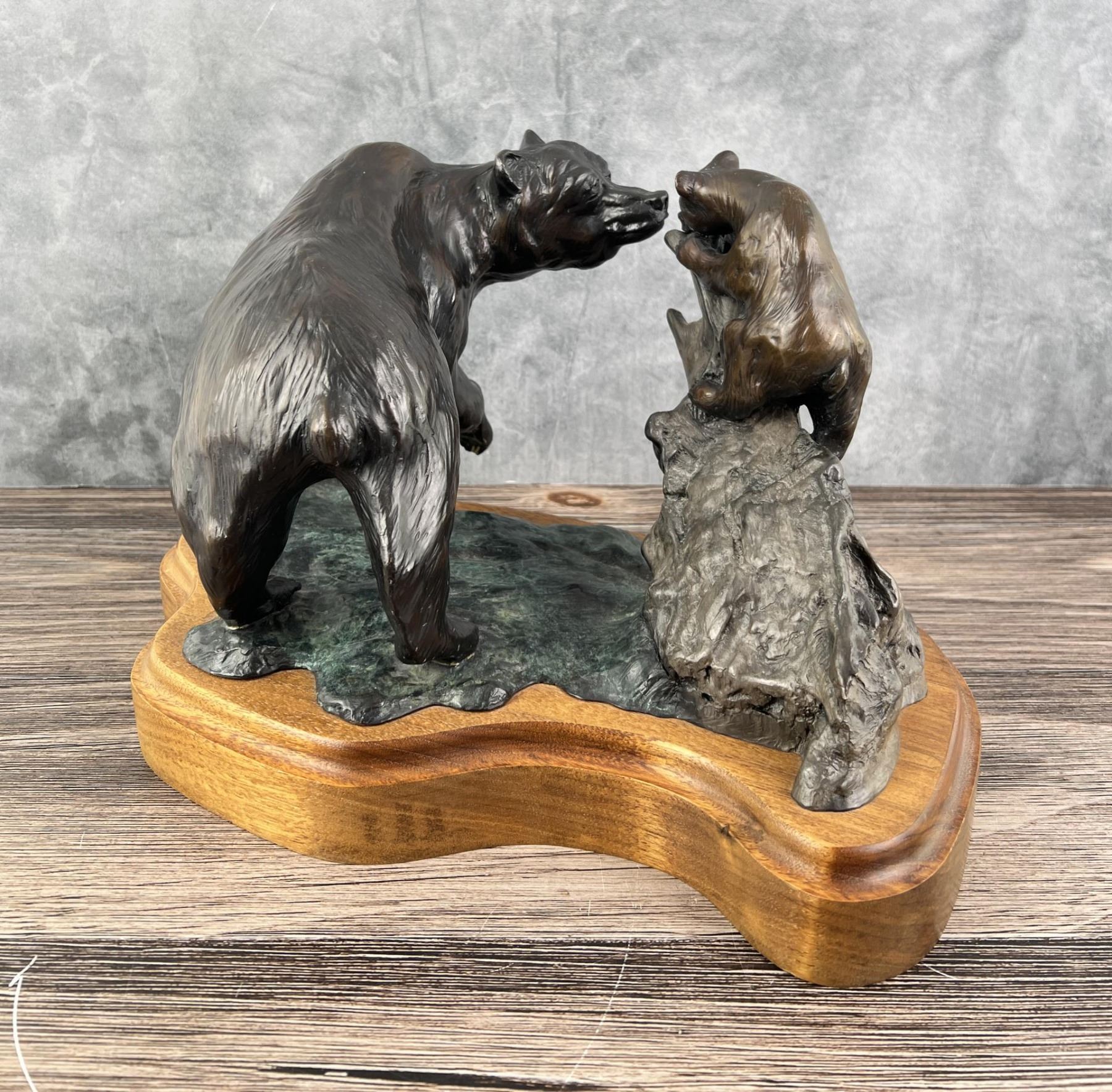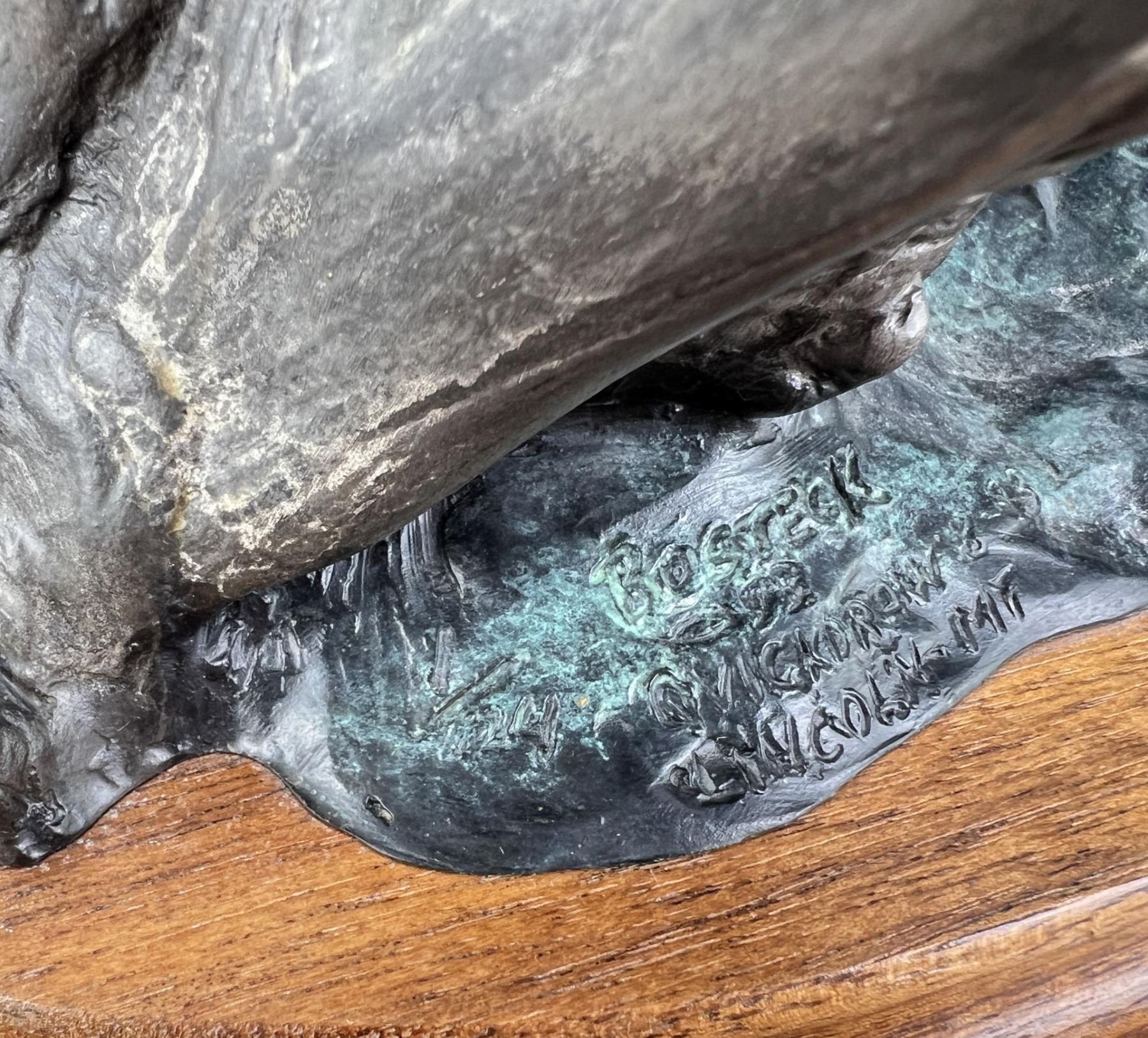 Title is The Tag Along. 15" by 10 1/2" by 9 1/4". Dave Rosteck (20th century) was active/lived in Montana. Dave Rosteck is known for Sculptor-wildlife. A resident of Great Falls, Montana, he has been a long-time participant in the C.M. Russell Auction. When he was in the fifth grade, one of his wire sculptures was displayed at the Russell Museum.