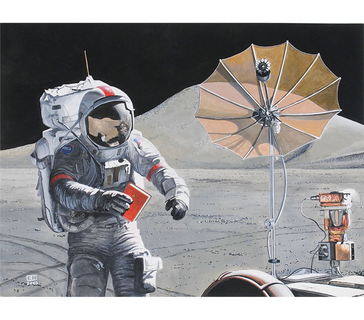 Gorgeous original watercolor painting by Ed Hengeveld entitled ‘Moment of Reflection,’ 15.75 x 11.75, showing Dave Scott placing a small red Bible on the lunar rover after parking it in its final resting place. Painting is signed in the lower left, “EH 2005.” In fine condition. Accompanied by a letter signed by Hengeveld describing the work, in part: “One of Scott’s last, symbolic actions on the Moon was to place a small red Bible on the lunar rover, leaning against the control panel. He didn’t mention it in his communications with Mission Control and it was only many years later that I read about this for the first time...Using my imagination I painted this rendition, hoping that this is how it would have looked to an observer at the scene.”
