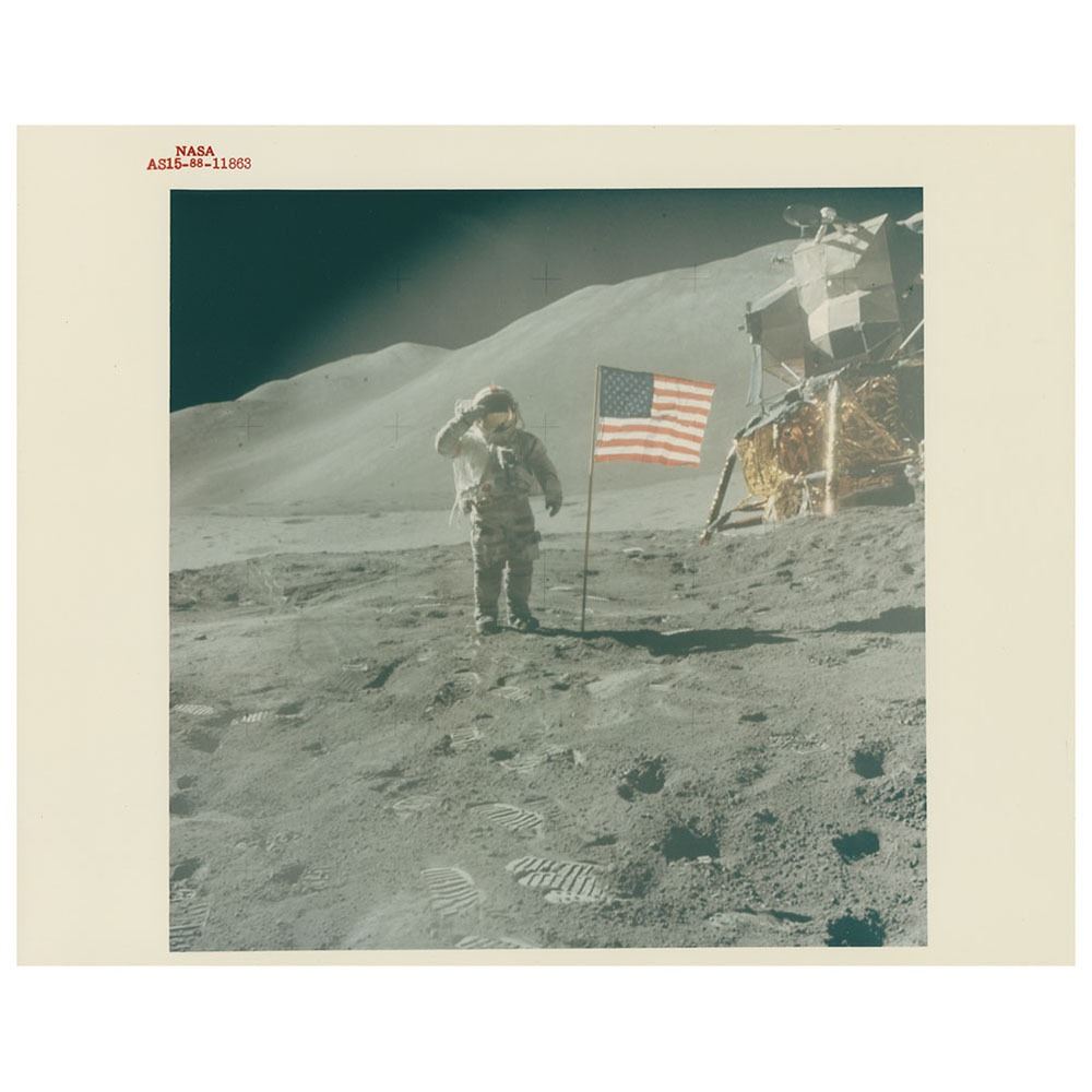 Official 'Type 1' color glossy 10 x 8 red-numbered NASA photo (AS15-88-11863), showing CDR Dave Scott saluting the American flag at the Apollo 15 landing site in the moon's Hadley-Apennine region. Reverse bears "A Kodak Paper" watermarks and purple NASA caption text. In fine condition, with small creases along the upper right edge.