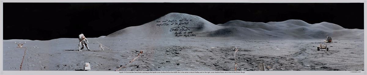 Impressive color satin-finish 40.25 x 8.5 panoramic photo of Apollo 15 Commander Dave Scott picking up the Apollo lunar surface drill with Mount Hadley in the background, signed in black felt tip, “Man must explore, and this is exploration at its greatest. Dave Scott, Apollo 15 CDR, July 30–Aug 2, 1971.” Rolled and in fine condition.