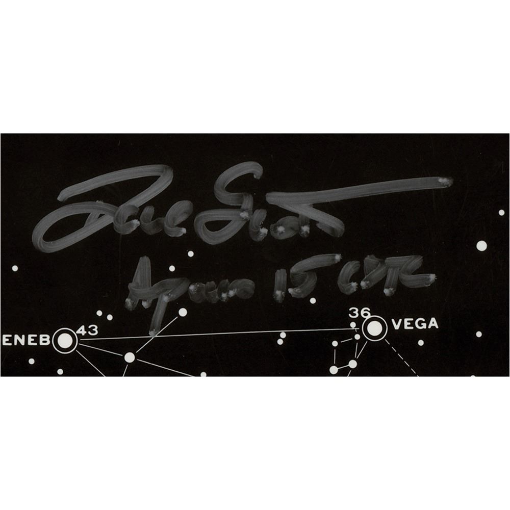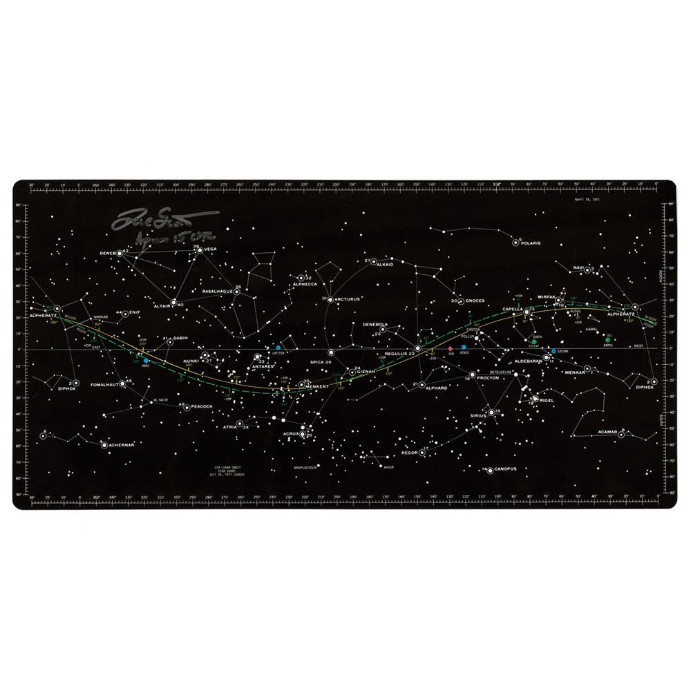 A "CSM Lunar Orbit†star chart for the Apollo 15 mission, 16 x 7.75, signed in silver ink, “Dave Scott, Apollo 15 CDR.†The start chart, identified near the lower left as “CSM Lunar Orbit, Star Chart, July 26, 1971 Launch,†includes the names of all Apollo navigation stars as well as trace lines that form the constellations used to locate and identify the stars. The chart is designed with the constellations aligned on the ecliptic, with specific stars used for Apollo navigation identified, named, and numbered with a two-digit numerical code ranging 1 (Alpheratz) to 45 (Fomalhaut). The chart was used to identify and locate specific stars such that an onboard optical device, the Sextant, could be used to determine the orientation of the spacecraft relative to an onboard Inertial Measurement Unit (IMU); the onboard computer (the Apollo Guidance Computer) would then calculate the location of the craft in inertial space. In fine condition.