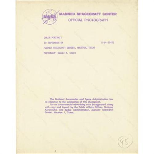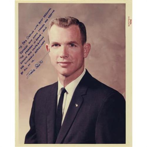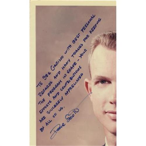<B>Dave Scott Signed Color Photograph,</B></I> 8"x10", "<I>To Joe Garino with best personal/ regards and many thanks for keeping/ the program in shape - your efforts and contributions/ are sincerely appreciated/ by all of us./ Dave Scott.</B></I>" As Apollo 15 Commander, Scott walked on the moon in 1971. <I>From the collection of renowned former physical trainer of the astronauts Joe Garino. This lot is accompanied by a signed certificate of authentication from Garino verifying its provenance.</B></I><BR><BR><b>Shipping:</b> Flat Material, Small (<a target="_blank" href="http://www.heritageauctions.com/common/shipping.php">view shipping information</a>)