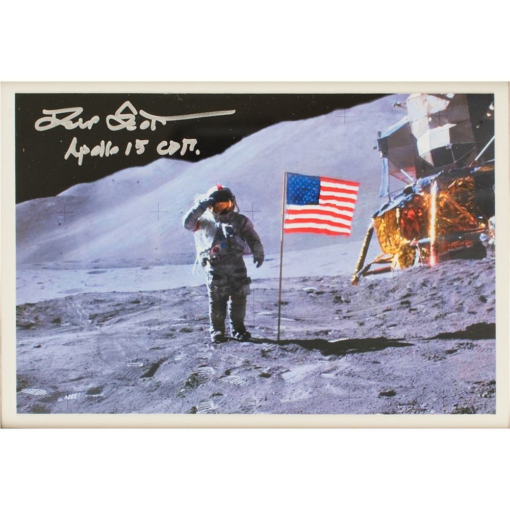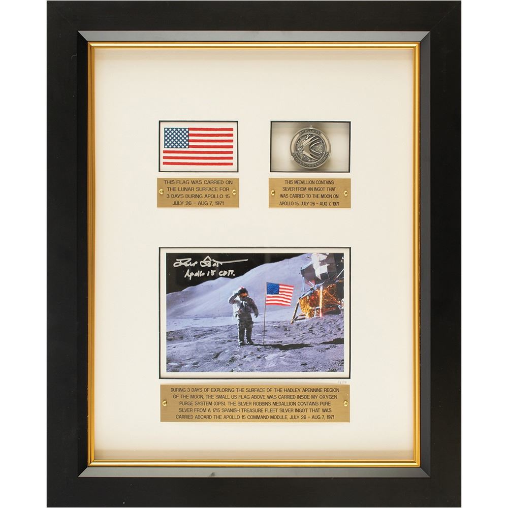 Magnificent limited edition display featuring one of Dave Scott's lunar surface flown 2.5 x 1.75 Beta cloth American flags and an Apollo 15 Robbins Medal, No. 137, minted using flown metal—approximately 20% of the silver was recovered from the wreck of the 1715 Spanish Plate Fleet and flown on Apollo 15. The display is numbered 4/10 and archivally matted and framed to an overall size of 13.75 x 17; also framed as part of the display is a color glossy 6 x 4 photo of Scott performing an EVA, signed in silver ink, “Dave Scott, Apollo 15 CDR,” and three engraved plates, with upper two plates certifying the flown status of the flag and medallion: "This flag was carried on the lunar surface for 3 days during Apollo 15, July 26–Aug 7, 1971” and “This medallion contains silver from an ingot that was carried to the moon on Apollo 15, July 26–Aug 7, 1971.” In overall fine condition.