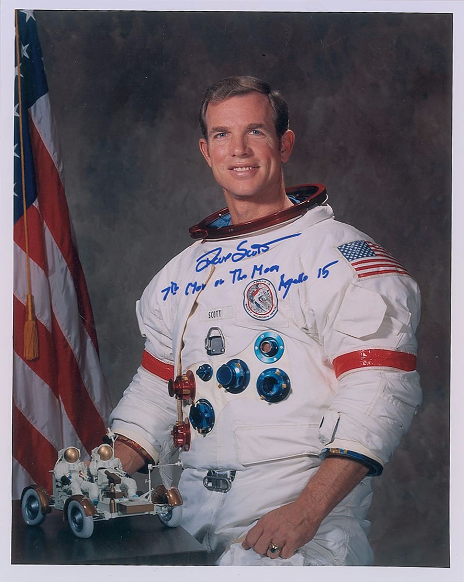 Color satin-finish 8 x 10 photo of Scott posing in his white spacesuit next to a lunar rover model and the American flag, signed in blue felt tip, “Dave Scott, 7th Man on the Moon, Apollo 15.” In very fine condition.