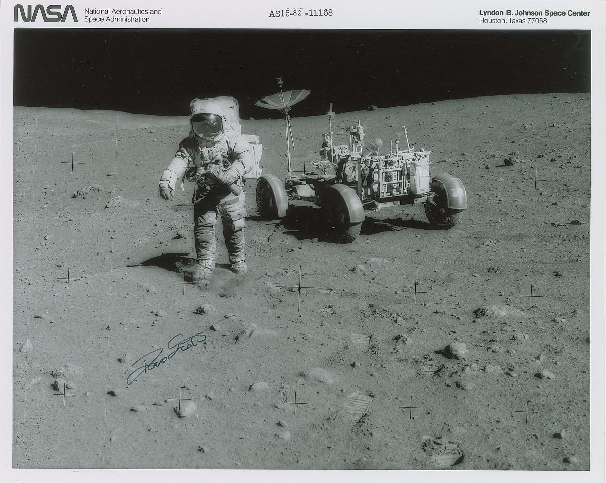 Official glossy 10 x 8 NASA photo of Dave Scott during the third and final Apollo 15 lunar EVA, signed in black felt tip. In very fine condition.