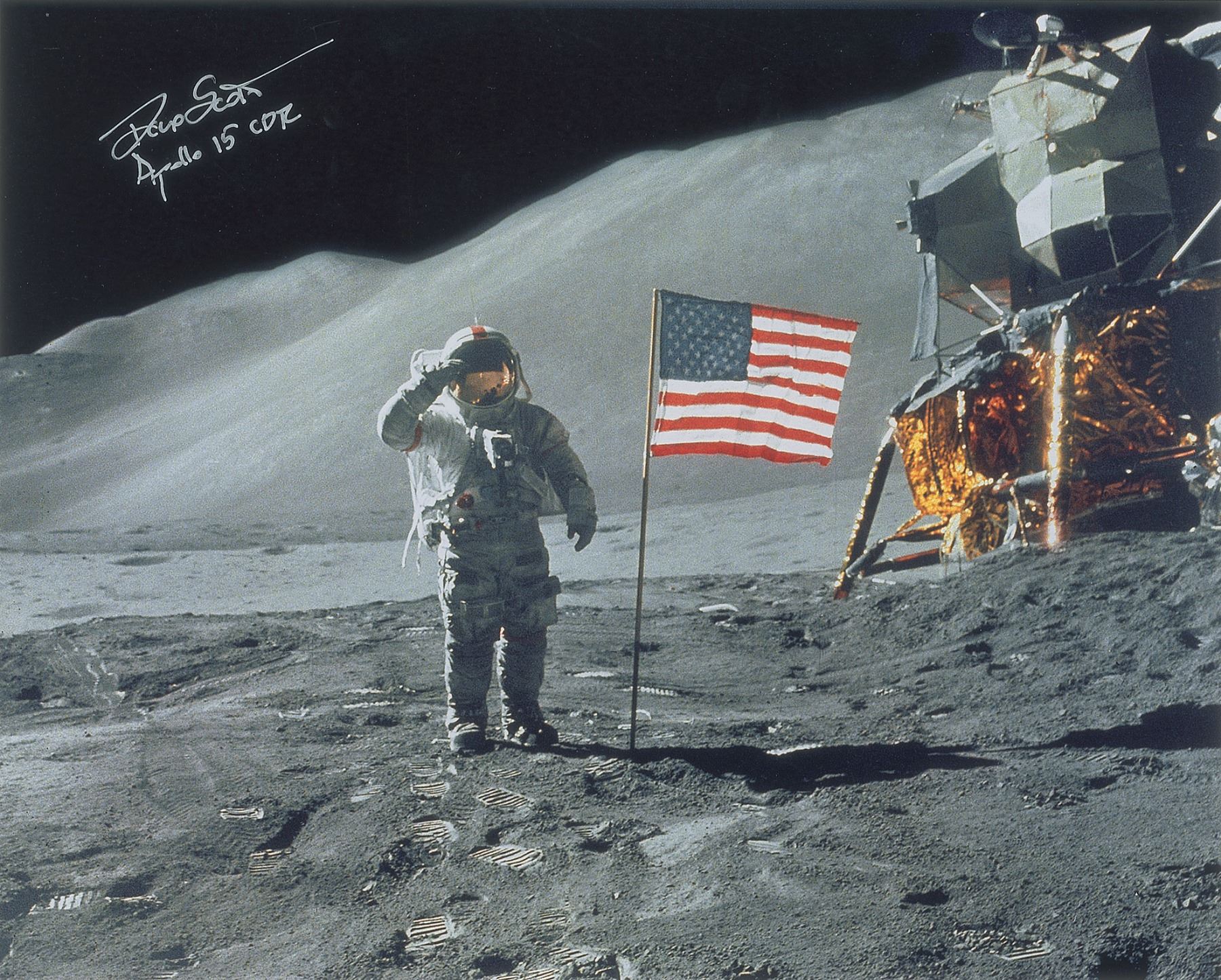 Appealing color semi-glossy 10 x 8 full-length photo of Commander Scott saluting the American flag on the lunar surface, signed in silver ink, "Dave Scott, Apollo 15 CDR." In very fine condition.