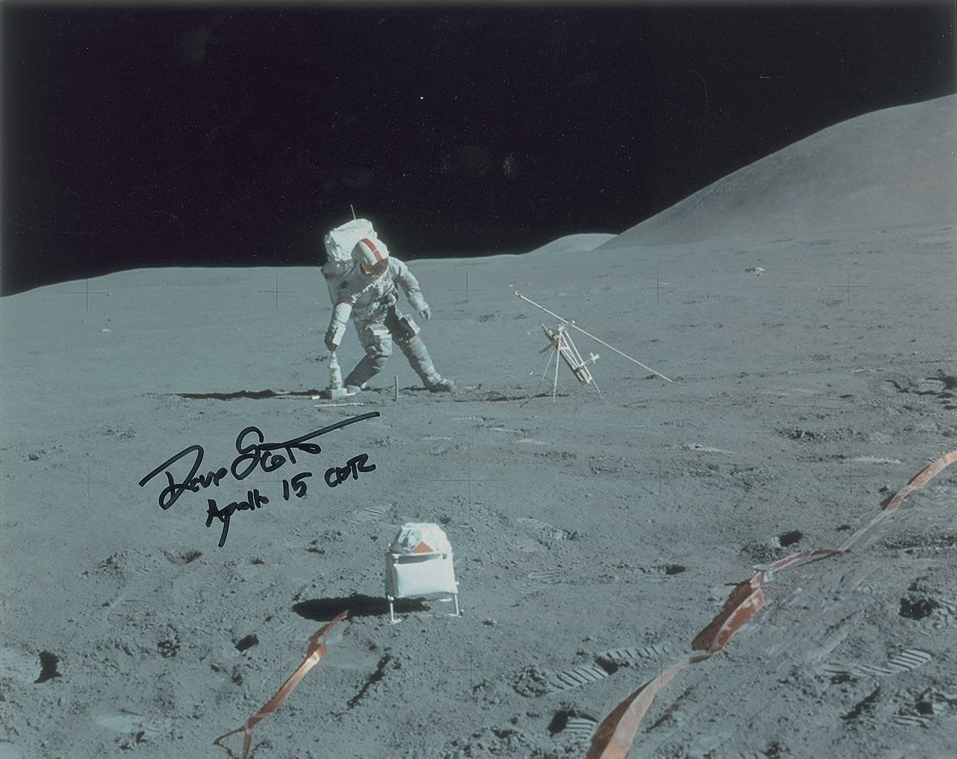 Color glossy 10 x 8 photo of Scott at the site of Apollo 15's lunar surface experiment package, signed in black felt tip, "Dave Scott, Apollo 15 CDR." In fine condition, with a trivial crease to the lower left corner tip.