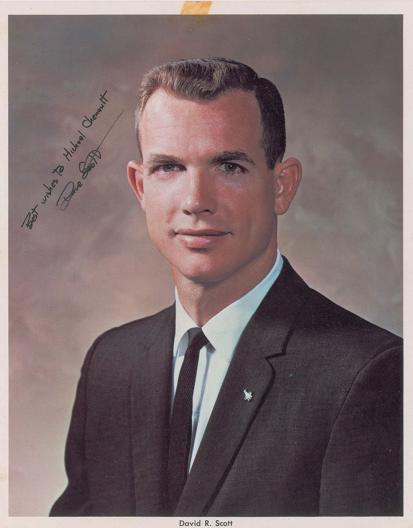 Official color 8 x 10 NASA lithograph of Scott in formal attire, signed and inscribed in black felt tip, "Best wishes to Michael Chenault, Dave Scott.” In fine condition, with an old tape stain to the top edge.
