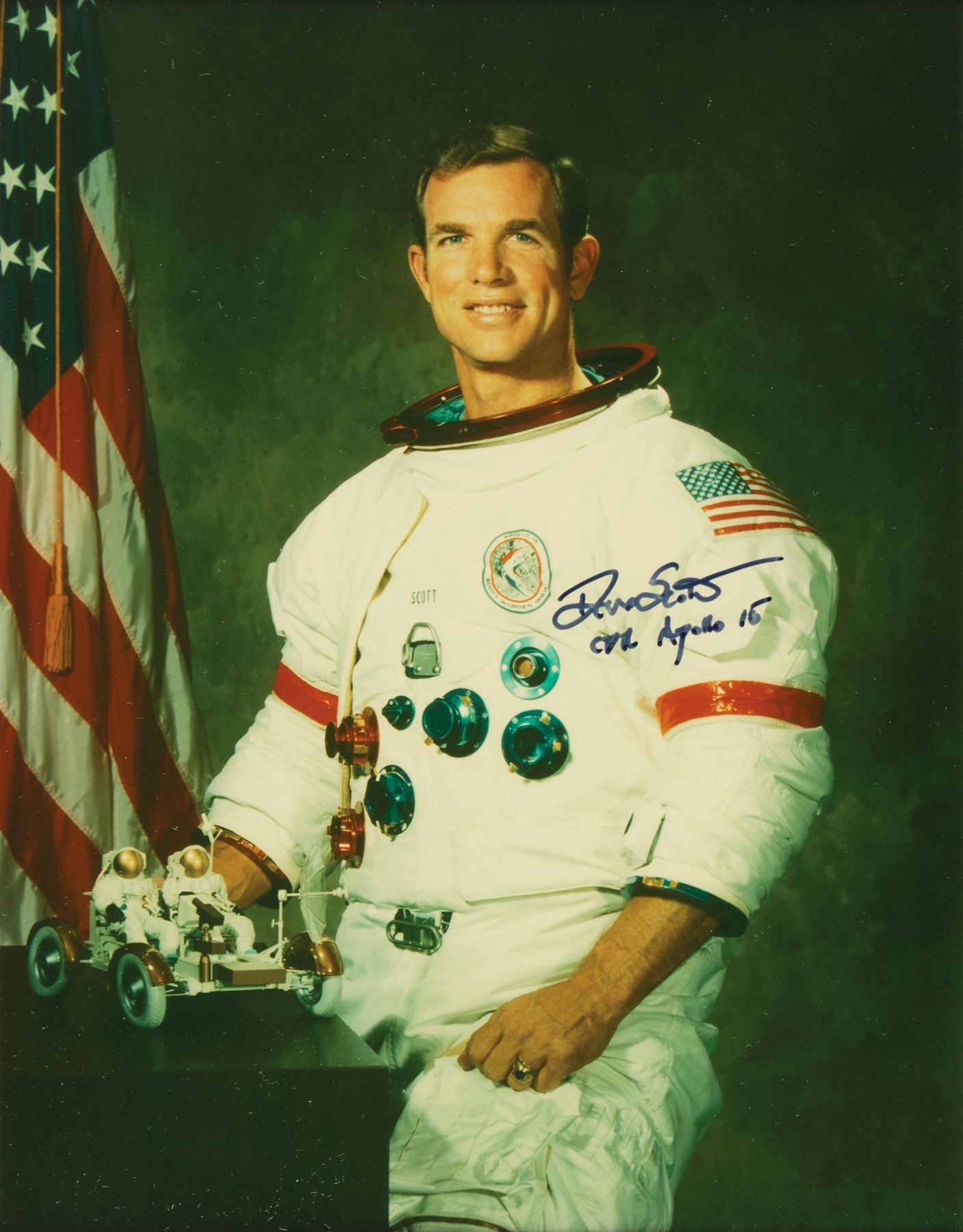 Color satin-finish 7 x 9 photo of Scott posing in his white space suit with a model of the LRV, signed in black felt tip, "Dave Scott, CDR Apollo 15." Double-matted and framed to an overall size of 12.25 x 14.25. In fine condition. Accompanied by a certificate of authenticity from Novaspace.