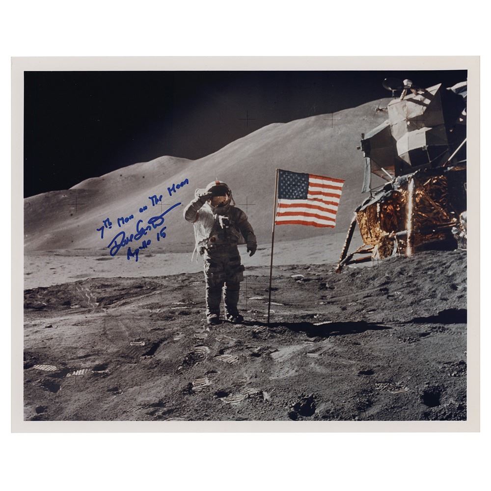 Color semi-glossy 10 x 8 photo of CDR Scott saluting the American flag during the Apollo 15 mission, signed in blue felt tip, "7th man on the moon, Dave Scott, Apollo 15." In very fine condition.