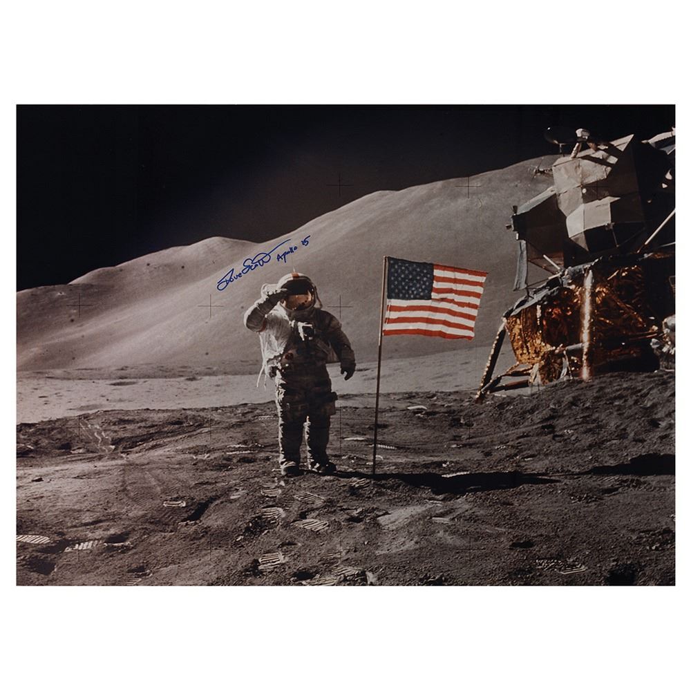 Color satin-finish 14 x 11 photo of Commander Scott saluting the American flag on the lunar surface during Apollo 15, signed in blue felt tip, "Dave Scott, Apollo 15." In very fine condition.