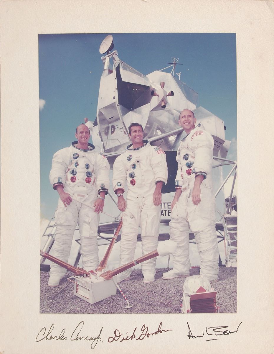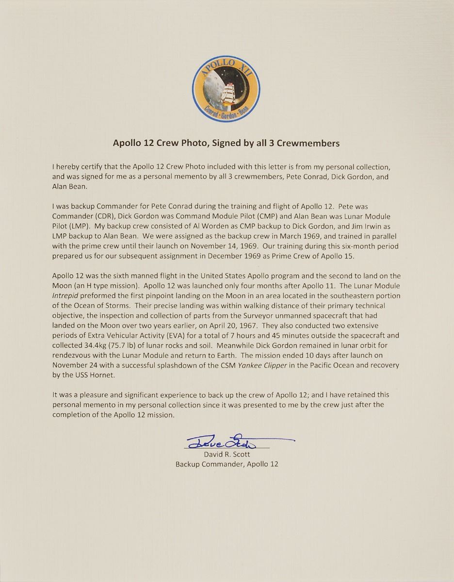 Ideal color semi-glossy 7 x 9.5 full-length photo of the Apollo 12 crew posing in their white space suits in front of the lunar lander, affixed to its original 10 x 12 mount, signed on the mount in black felt tip, “Charles Conrad, Jr.,” “Dick Gordon,” and “Alan L. Bean.” In very good to fine condition. Accompanied by a signed letter of authenticity from Scott, in part: “I hereby certify that the Apollo 12 Crew Photo...is from my personal collection, and was signed for me as a personal memento by all 3 crewmembers Pete Conrad, Dick Gordon, and Alan Bean. I was backup Commander for Pete Conrad during the training and flight of Apollo 12...It was a pleasure and significant experience to back up the crew of Apollo 12; and I have retained this personal memento in my personal collection since it was presented to me by the crew just after the completion of the Apollo 12 mission.”