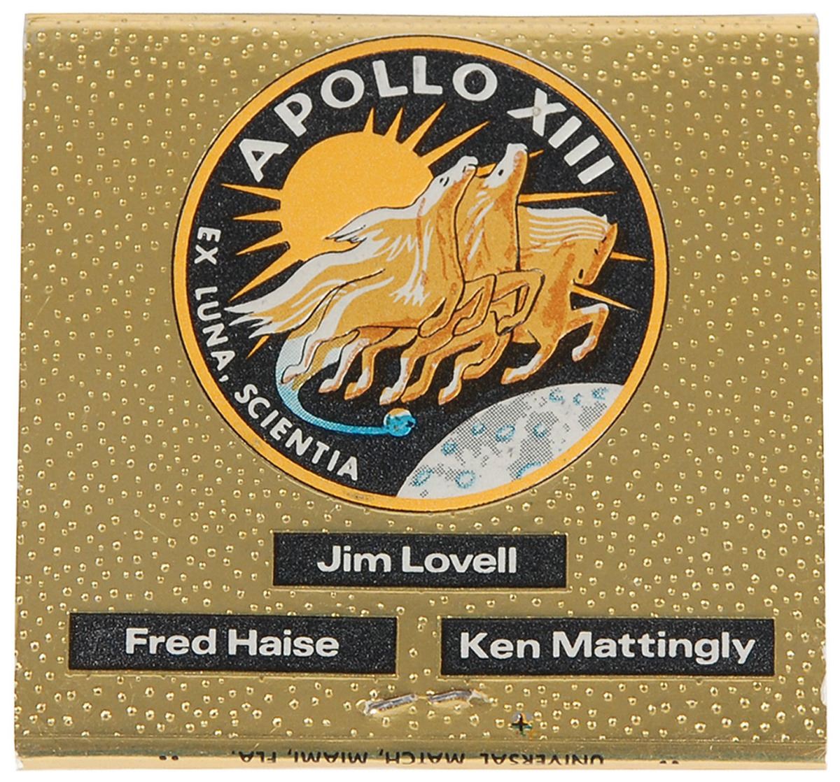 Dave Scott’s personally-owned unused gold foil Apollo 13 pre-launch matchbook, 2 x 2, featuring the names of the original prime crew, “Jim Lovell,” “Fred Haise,” and “Ken Mattingly.” Mattingly, of course, was replaced on the mission by Jack Swigert after he was exposed to German measles shortly before launch. In fine condition.