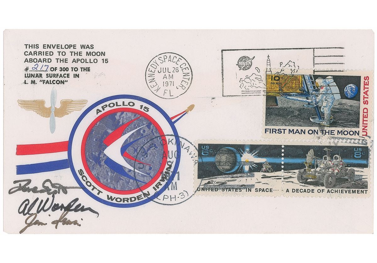 Apollo 15 postal cover, 6.5 x 3.75, numbered 217 of 300, carried to the lunar surface aboard the Lunar Module Falcon, signed in the lower left corner by crew members Dave Scott, Al Worden, and Jim Irwin. In fine condition. This particular cover comes from astronaut Dave Scott’s personal collection, and retains its original informational card insert, signed by Scott. Accompanied by a one-page typed notarized certification, signed “Alfred M. Worden,” “David R. Scott,” and “James B. Irwin.” The provenance reads in part: “Postal covers were carried aboard the Apollo 15 Mission, which postal covers were stamped and postmarked at Kennedy Space Center, Florida, on the date of the launch, July 26, 1971, and carried aboard the Apollo 15 Spacecraft during the entire term of the Mission, to include landing on the moon and were returned to the Earth at the termination of the Mission on August 7, 1971…The postal covers were in the possession of one or more of the undersigned until 1972, at which time they were deposited with the United States Government…The undersigned have this date inspected Postal Cover No. 45, bearing NASA Serial No. 056, and aver, affirm and certify that said Postal Cover is a cover which was carried aboard the United States Lunar Mission—Apollo 15.” All three crew members have also added their initials to a small correction in the text. Also included is a handwritten and signed letter from Scott to the original recipient, Leon Ford, in full: “This cover (#217) has made many travels—both to the moon and here on Earth. I hope you enjoy it!!” In fine condition. Enhanced by the controversy surrounding their confiscation and subsequent 11-year detainment, Sieger covers remain a highly desirable item for philatelists and space collectors alike.