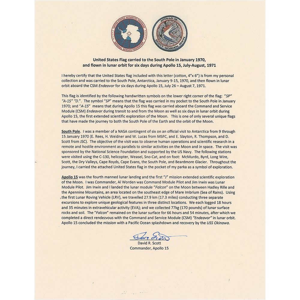 Flown 5.75 x 4 American flag carried to the South Pole from January 9-15, 1970, and then flown to lunar orbit aboard the Command Module Endeavor during the Apollo 15 mission from July 26-August 7, 1971, signed by Dave Scott with his first initial on the bottom white stripe in blue ink, "D," adding, "SP, A-15." In fine condition. Accompanied by a signed letter of provenance from Scott, in part: "I hereby certify that the United States flag included with this letter…was carried to the South Pole, Antarctica…and then flown in lunar orbit for six days aboard the CSM Endeavor during Apollo 15…The symbol 'SP' means that the flag was carried in my pocket to the South Pole…and 'A-15' means that during Apollo 15 this flag was carried aboard the Command and Service Module (CSM) Endeavor…This is one of only several unique flags that have made the journey to both the South Pole of the Earth and the orbit of the Moon." Flags carried on any Apollo mission are highly desirable, with this particular flag making an extra trip to Earth's southernmost point during Scott's 1970 NASA research trip to Antarctica. From the personal collection of Dave Scott.