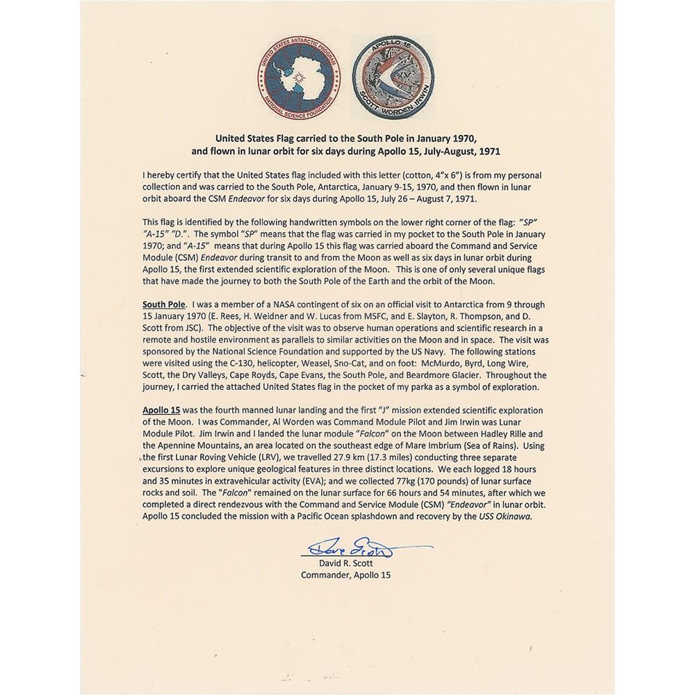 Flown 5.75 x 4 American flag carried to the South Pole from January 9-15, 1970, and then flown to lunar orbit aboard the Command Module Endeavor during the Apollo 15 mission from July 26-August 7, 1971, signed by Dave Scott with his first initial on the bottom white stripe in blue ink, "D," adding, "SP, A-15." In fine condition. Accompanied by a signed letter of provenance from Scott, in part: "I hereby certify that the United States flag included with this letter‰Û_was carried to the South Pole, Antarctica‰Û_and then flown in lunar orbit for six days aboard the CSM Endeavor during Apollo 15‰Û_The symbol 'SP' means that the flag was carried in my pocket to the South Pole‰Û_and 'A-15' means that during Apollo 15 this flag was carried aboard the Command and Service Module (CSM) Endeavor‰Û_This is one of only several unique flags that have made the journey to both the South Pole of the Earth and the orbit of the Moon." Flags carried on any Apollo mission are highly desirable, with this particular flag making an extra trip to Earth's southernmost point during Scott's 1970 NASA research trip to Antarctica. From the personal collection of Dave Scott.