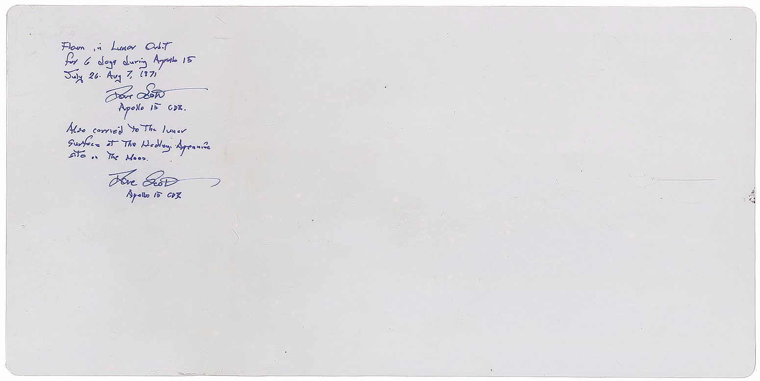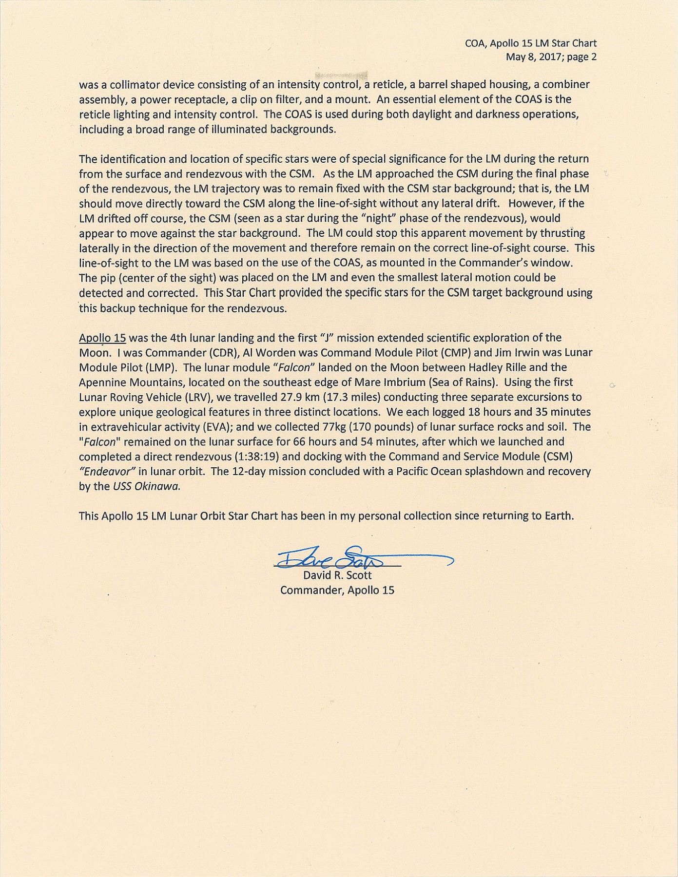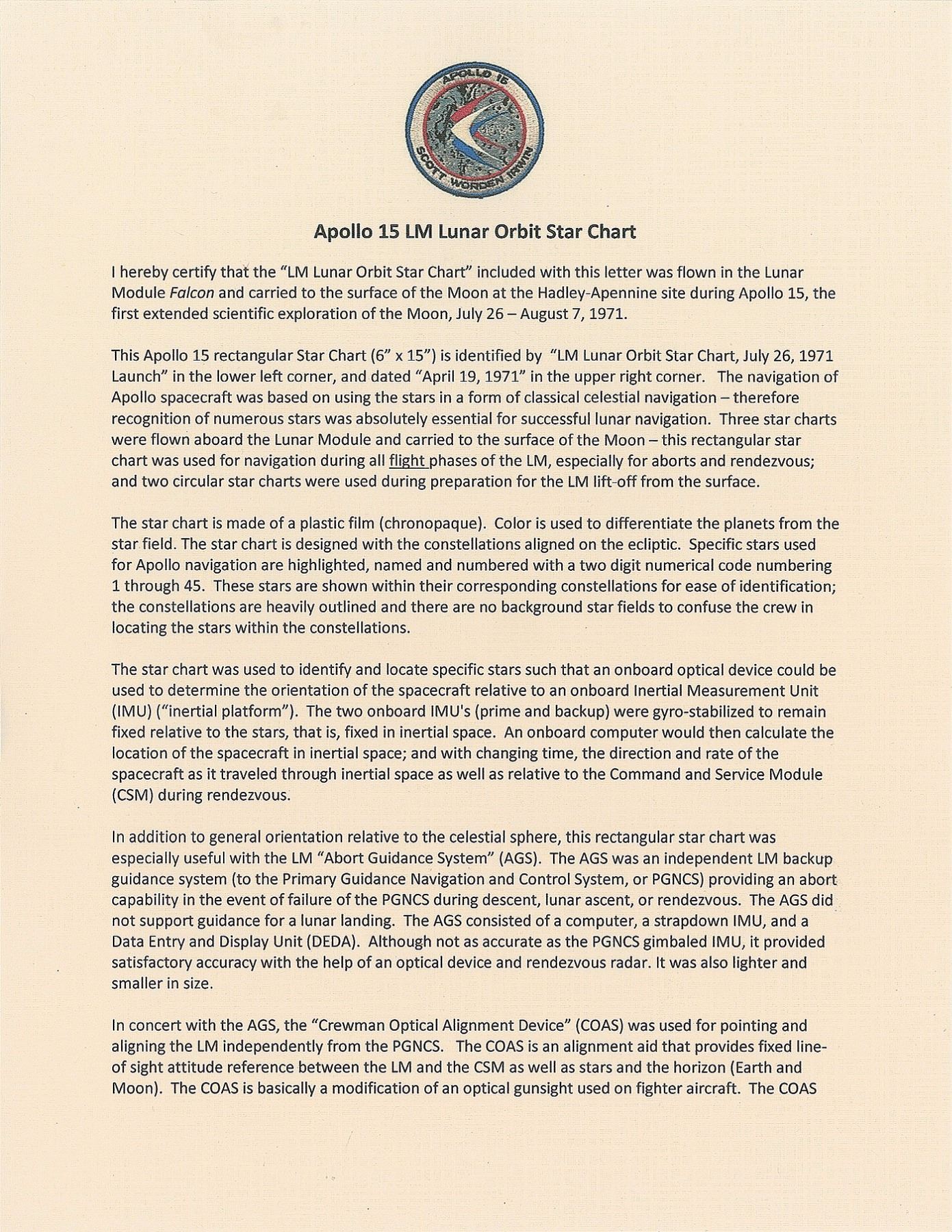 Flown lunar orbit star chart used on the Apollo 15 mission, entitled "LM Lunar Orbit, Star Chart, July 26, 1971 Launch," one page, 15.75 x 7.75, signed and certified on the reverse in blue felt tip, "Flown in Lunar Orbit for 6 days during Apollo 15, July 26–Aug 7, 1971. Dave Scott, Apollo 15 CDR. Also carried to the lunar surface at the Hadley-Apennine site on the Moon. Dave Scott, Apollo 15 CDR." In fine condition. Accompanied by a detailed signed letter of provenance from Dave Scott, in part: "I hereby certify that the ‘LM Lunar Orbit Star Chart’ included with this letter was flown in the Lunar Module Falcon and carried to the surface of the Moon at the Hadley-Apennine site during Apollo 15, the first extended scientific exploration of the Moon, July 26–August 7, 1971…The navigation of Apollo spacecraft was based on using the stars in a form of classical celestial navigation—therefore recognition of numerous stars was absolutely essential for successful lunar navigation. Three star charts were flown aboard the Lunar Module and carried to the surface of the Moon—this rectangular star chart was used for navigation during all flight phases of the LM, especially for aborts and rendezvous; and two circular star charts were used during preparation for the LM lift-off from the surface.